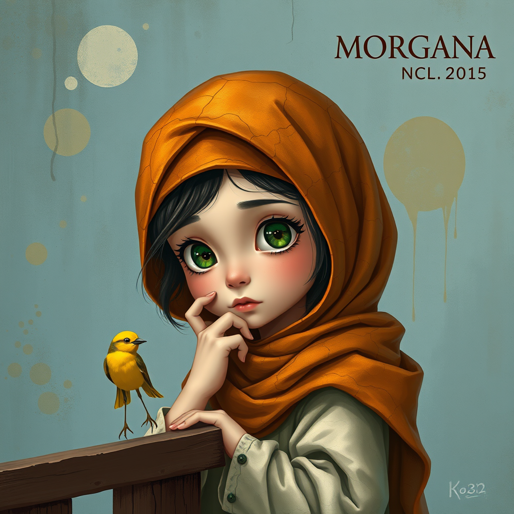 An enchanting illustration captures a young girl with delicate features and large emerald eyes, her head adorned with a richly textured, burnt orange-patterned headscarf and a matching cloak that boasts cracks mimicking the graceful wear of aged paint. In a pose of deep contemplation, she gently rests her chin on her hand, her gaze deeply focused on a tiny, vibrant canary-yellow bird perched on a rustic wooden railing. Behind her, the backdrop unfolds as a muted artistic canvas of blue hues, textured with abstract, softly faded shapes that evoke the mystery of an ancient mural. The scene is imbued with whimsy, nostalgia, and fantasy, exuding a painterly quality with intricate details. The name ‘MORGANA’ elegantly graces the top right corner, hinting at the creator or source of this captivating artwork.
