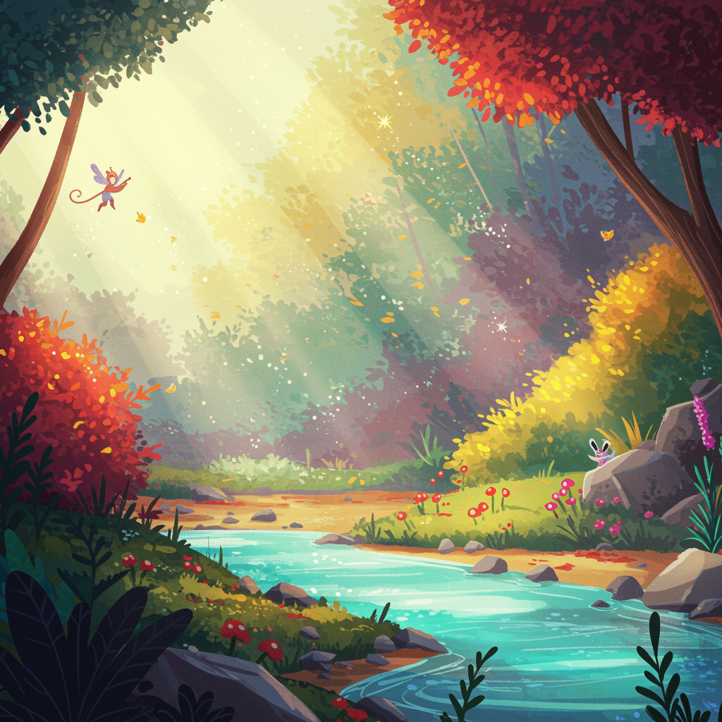 An enchanting illustration depicting a serene and tranquil landscape, where a vibrant and colorful forest forms the background. Gentle beams of sunlight dance through the leaves, creating a mosaic of soft hues. In the foreground, a crystal-clear river meanders gracefully, its surface shimmering with reflections of the surrounding foliage. The entire scene is imbued with a fairy tale charm, as whimsical creatures flit about, adding a touch of enchantment to the peaceful setting.
