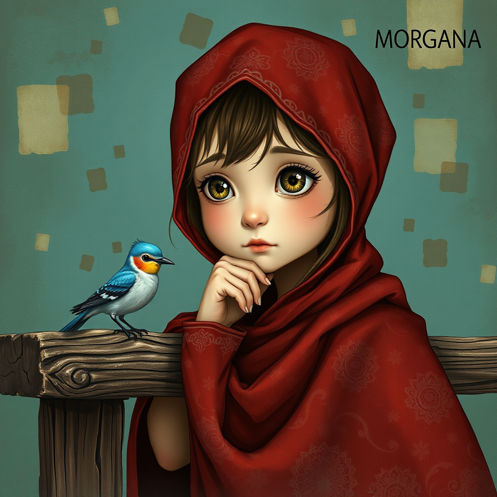 An enchanting illustration depicts a young girl with delicate features and mesmerizing large hazel eyes, adorned with a richly textured, deep red-patterned headscarf and a matching cloak with intricate designs resembling cracked, aged paint. She rests her chin on her hand in a contemplative pose, her expression drawn towards a small, luminescent azure bird perched on a rustic wooden railing. The background unfurls as a subdued, artistic teal-toned textured wall, interspersed with abstract, faded shapes echoing an ancient mural. The scene weaves a tapestry of whimsy, nostalgia, and fantasy, enriched with exquisite details and a gentle, painterly quality. The name 'MORGANA' graces the upper right corner, perhaps indicating the creator of this captivating artwork.