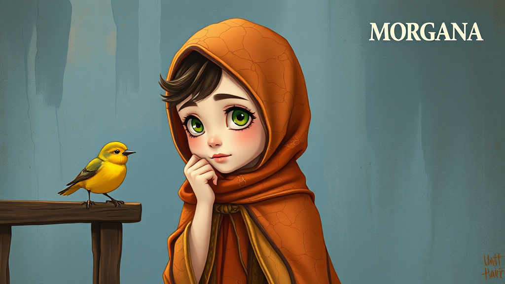 An enchanting illustration features a young girl with delicate features and large, curious green eyes. She wears a textured, orange-patterned headscarf and a matching cloak with intricate designs resembling aged paint cracks. Gently resting her chin on her hand in a pensive pose, she gazes thoughtfully at a small, vibrant yellow bird perched on a rustic wooden rail. The backdrop is a muted, artistic blue-toned textured wall adorned with abstract, faded shapes reminiscent of an ancient mural. The scene exudes a whimsical flair, infused with nostalgia and fantasy, showcasing fine details and a soft, painterly aesthetic. In the top right corner, the word 'MORGANA' subtly marks the piece, hinting at the artist or inspiration.