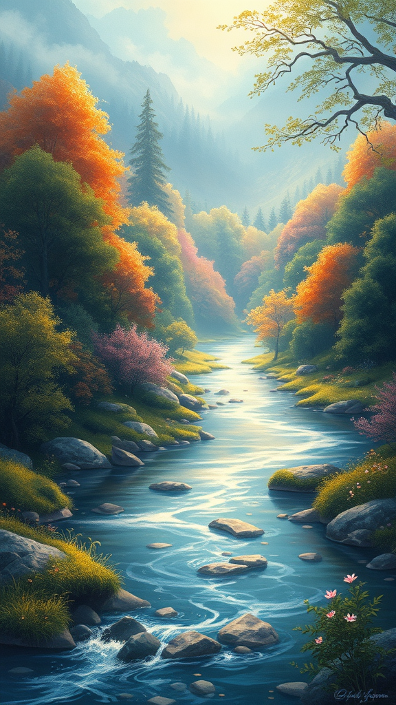 An enchanting illustration of a serene landscape that radiates tranquility and harmony; the backdrop is a lush, vibrant forest with a tapestry of rich colors; a gentle brook winds through the foreground, its waters shimmering with hints of silver and gold; the scene is rendered in an ethereal, fairy tale style with whimsical touches and a dreamlike atmosphere.