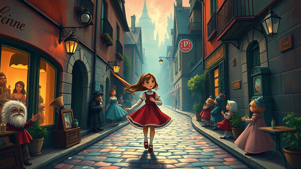 An enchanting illustration of a young girl gracefully walking down a quaint cobblestone street, created in a captivating blend of Disney's classic animation style and the pre-World War II School of Paris. The scene is painted in vibrant 32k UHD detail, with striking hues of red and emerald that bring the scene to life. Around her, a lively tableau unfolds, populated with whimsical character caricatures, each with their own distinct personality. The backdrop is mysterious, hinting at a world of secrets and stories waiting to be discovered, while the composition is designed with an elongated aspect ratio, capturing the charm and intrigue of this timeless moment.