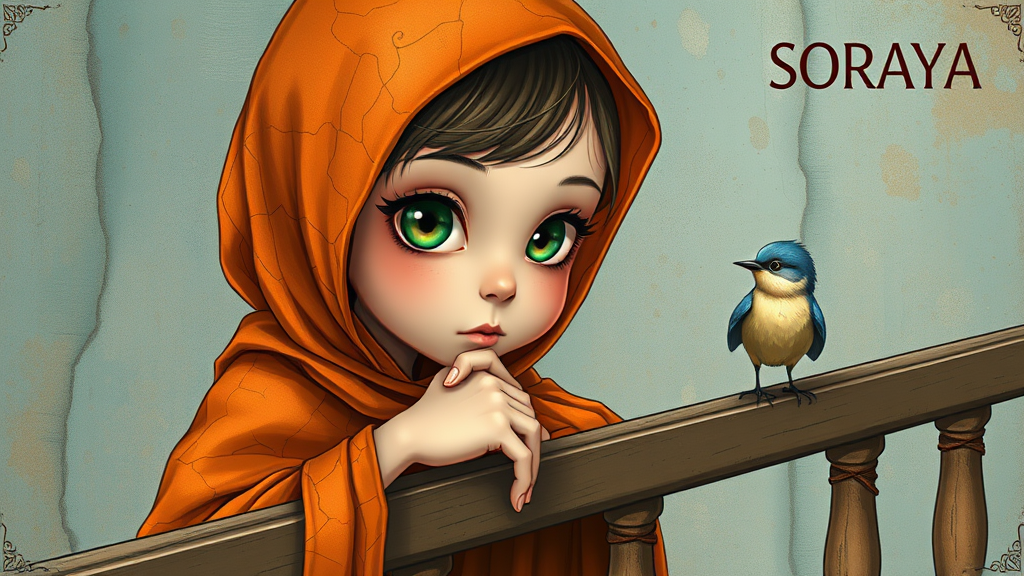 An enchanting illustration portrays a young girl with delicate features and striking large green eyes. Her attire includes a vibrant orange-patterned headscarf and a coordinating cloak, textured with the appearance of weathered, cracked paint. In a thoughtful pose, she rests her chin on her hand, gazing intently at a tiny, lively blue bird perched gently on a wooden railing. The backdrop reveals a muted, artistic composition, featuring a softly hued blue-toned wall with abstract, faded shapes evocative of an ancient mural. The scene conveys a captivating blend of whimsy, nostalgia, and surreal fantasy, embellished with intricate details and a soft, painterly essence. The word 'SORAYA' is elegantly inscribed in the top right corner, suggesting the source or creator of the artwork.