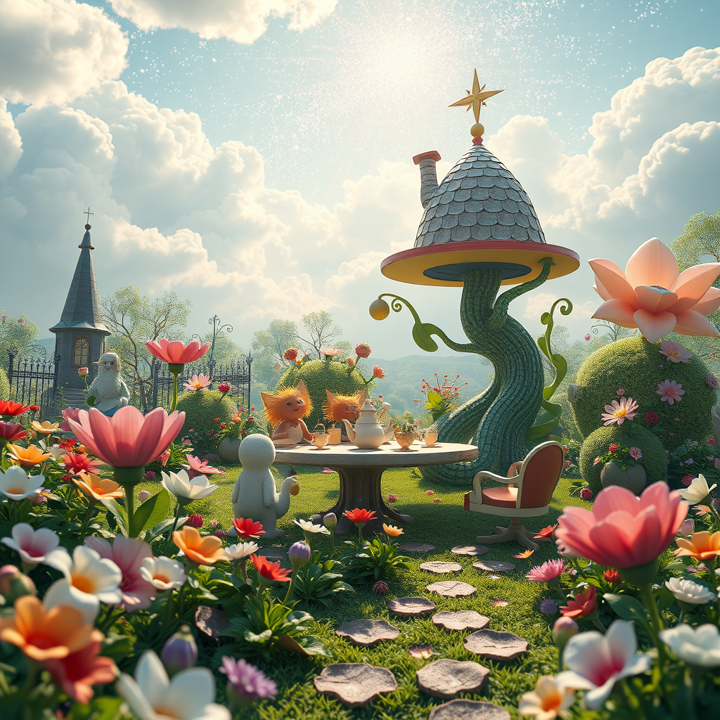 An enchanting scene inspired by Alice in Wonderland, immersed in the whimsical allure of magic and fairy tales, where an awe-inspiring, beautifully detailed 3D world comes to life. Rendered with the stunning capabilities of Unreal Engine and Octane Render, the scene captures a fantastical landscape filled with charming characters and surreal elements, evoking a sense of cuteness and wonder. A vibrant garden with oversized flowers and curious creatures plays host to a playful tea party under a vast, sparkling sky, seamlessly brought together with the artistry of Adobe Photoshop to enhance the visual delight and immersive storytelling.