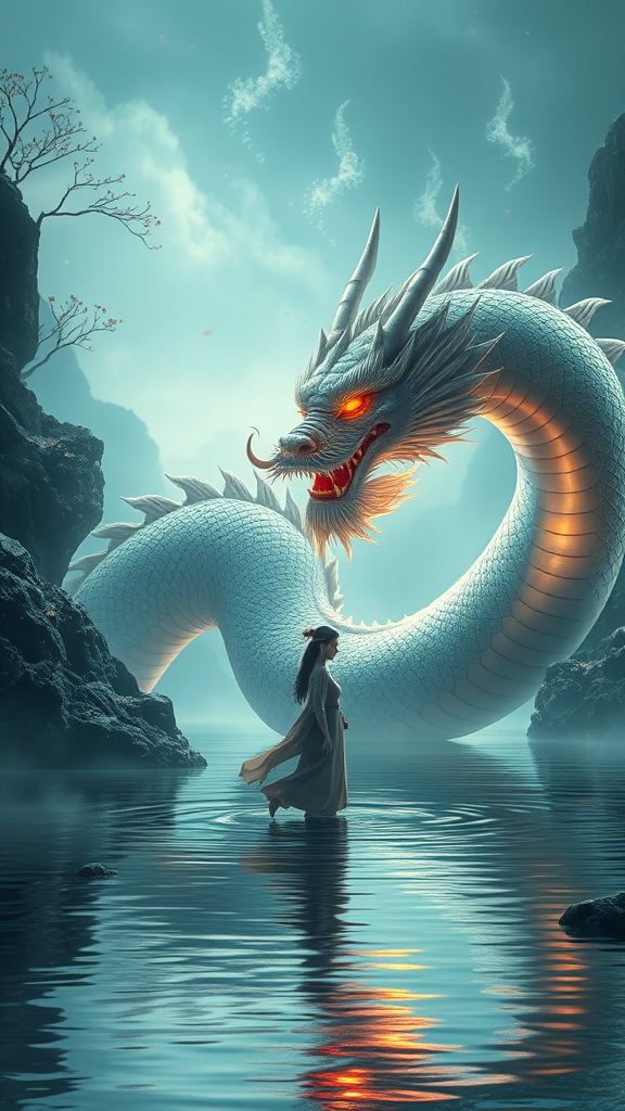 An enchanting scene unfolds as a solitary figure stands in the water beside an elegant Chinese dragon, illuminated by a fantasy world’s ethereal glow. The image is captured with realistic detail and clarity, reminiscent of the works of Theo Prins and Kuang Hong, showcasing sharp 8k photorealism in a highly detailed 2D landscape. The dragon's scales glisten with iridescent hues, as delicate wisps of mist linger in the cool air. The person, donning flowing, intricately woven garments, stands confidently, their gaze meeting the dragon's wise eyes. The seamless blend of mythical and natural elements paints a vivid, immersive picture of harmony and awe.