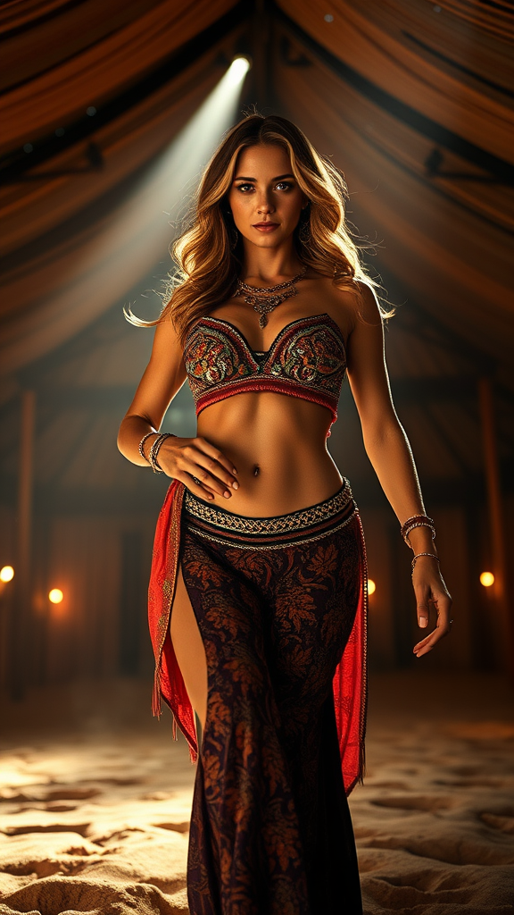 An enchanting woman of striking allure stands poised in the center of a sand dance pit, her muscular yet svelte physique accentuated by her ornately embroidered attire. Her waist-length hair, a delicate shade of dusty rose, cascades around her, framing her radiant bright blue eyes that hold a gaze both sultry and contemplative. Her belly dancing ensemble is a masterpiece in intricate embroidery, the top paired with a richly detailed deep dark blue bottom. Gentle sunlight filters through the overhead canopy, casting a play of dappled shadows across her figure, while the surrounding torchlight bathes the scene in a warm glow, highlighting the intricate textures of her attire and the hypnotic sway of her movements. Her expression exudes quiet confidence as she connects with the viewer through her captivating gaze. In a wide-angle view from a low angle, her presence commands attention, echoing the timeless style of Luis Royo. The scene captures the dance of light and shadow, magnifying her enchanting allure amidst the atmospheric setting.