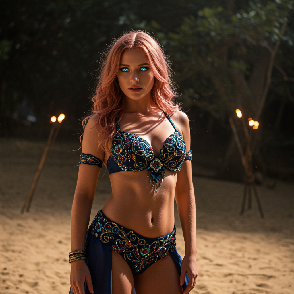 An enchanting woman with waist-length, dusty rose hair and captivating bright blue eyes stands poised in the tranquil center of a sand dance pit. Her physique is elegantly muscular, and she exudes quiet confidence. Her attire is richly detailed: an intricately embroidered and embellished belly dancing top complemented by a deep midnight blue bottom with ornate designs. Her expression is a mix of sultry allure and introspective contemplation, her gaze locking with the viewer's. Gentle shadows play across her figure as dappled sunlight filters through the canopy, adding a mystic quality to her silhouette. The environment is bathed in soft torchlight, enhancing textures around her and creating an atmosphere of allure. The scene captures her full essence in a wide-angle, low perspective, emphasizing her beguiling presence, inspired by the artistic style of Luis Royo.