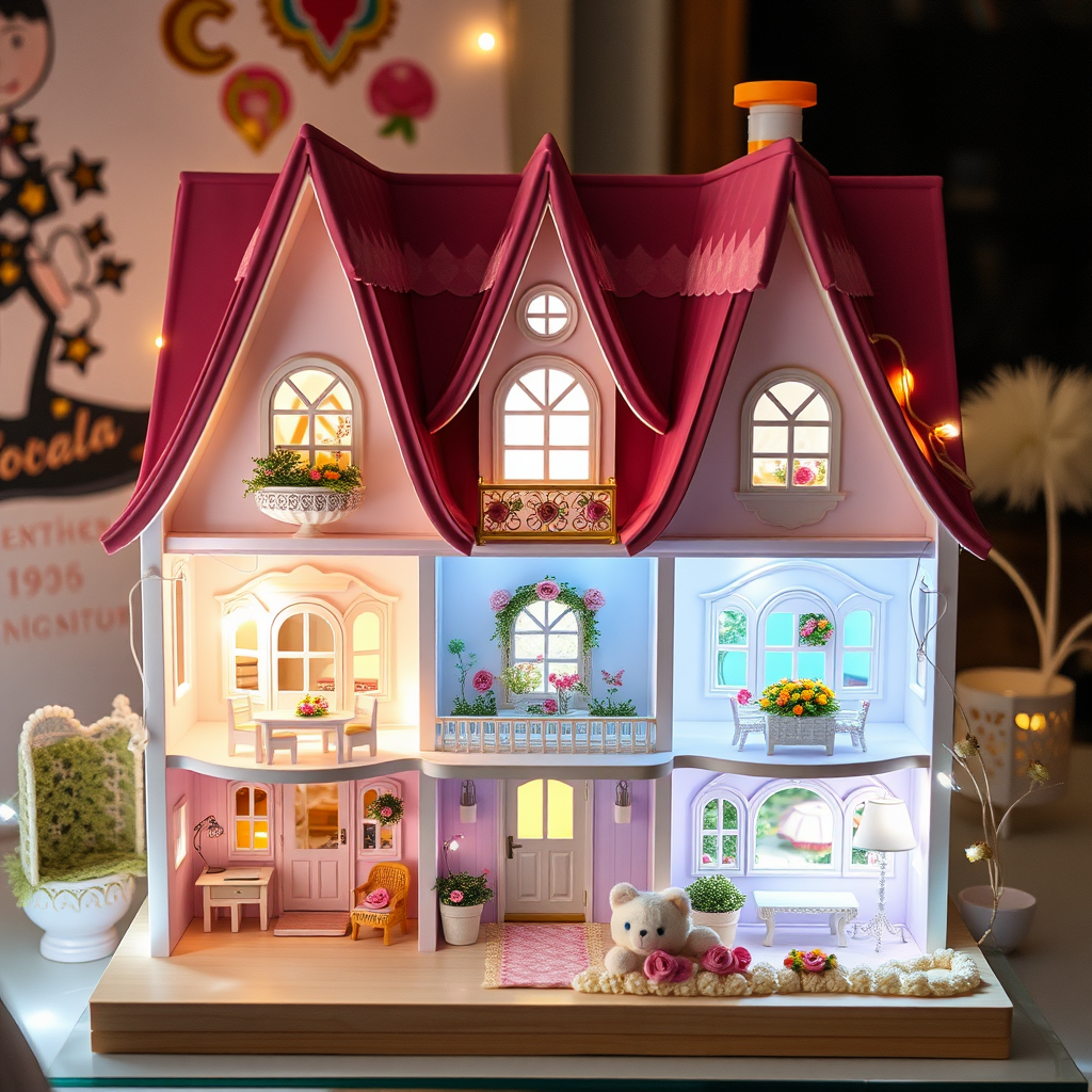 An enchantingly beautiful dollhouse, infused with a whimsical kawaii aesthetic, exuding a joyful and serene aura.