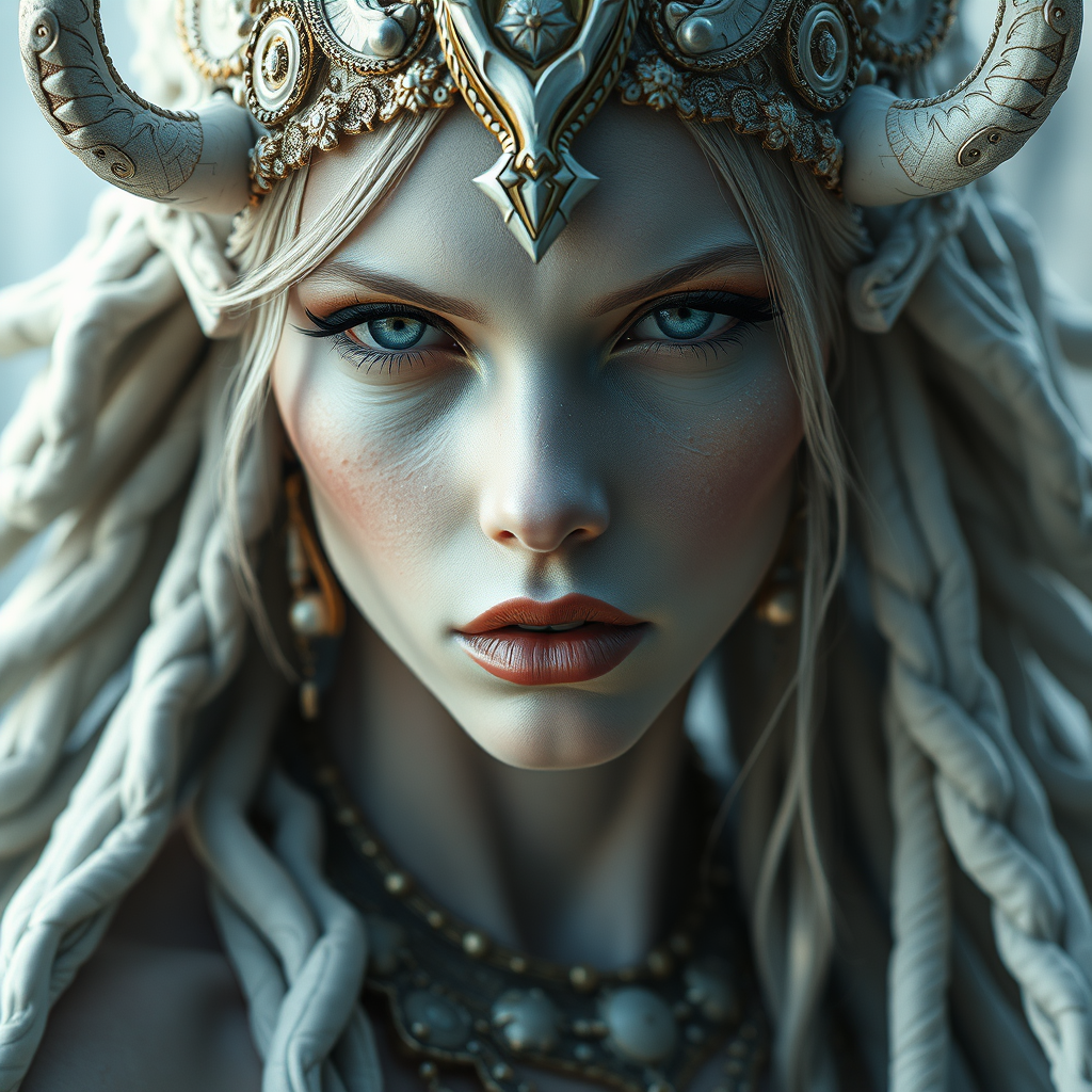 An enigmatic ancient ethereal queen with otherworldly allure, showcasing smooth white ash skin and an athletic form, emits compelling emotions. The scene presents a close-up portrait with a detailed and bright setting, blending imaginative fantasy and science fiction with mythological elements. This epic depiction evokes a spirit of adventure with stunning graphics, intricate compositions, and fantastical subjects, inviting viewers into a surreal realm. With highly refined details and an atmosphere reminiscent of a Julie Bell masterpiece, the artwork captivates with its breathtaking quality and innovation.
