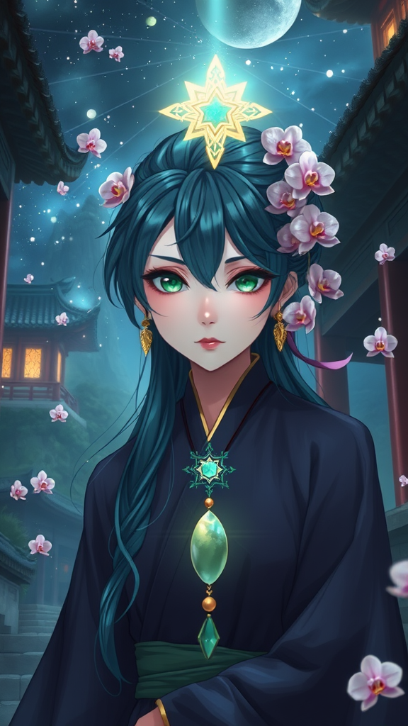 An enigmatic anime sorcerer from the Tang dynasty stands at midnight within an ancient temple, adorned with an orchid hair accessory and a jade charm. Their emerald green eyes and midnight blue hair shimmer in the mystical landscape. A celestial star ornament gleams atop their head, surrounded by flowing robes. They gaze directly at the viewer with a serene confidence. The scene is captured in a wide-angle portrait. The atmosphere is bathed in ethereal lighting, reminiscent of a thousand constellations. Orchid blossoms float around like magical sparks, enhancing the mystical aura. The style is inspired by Kay Nielsen, blending mixed media with expressive details, set against a backdrop where ancient architecture and nature converge in harmony.
