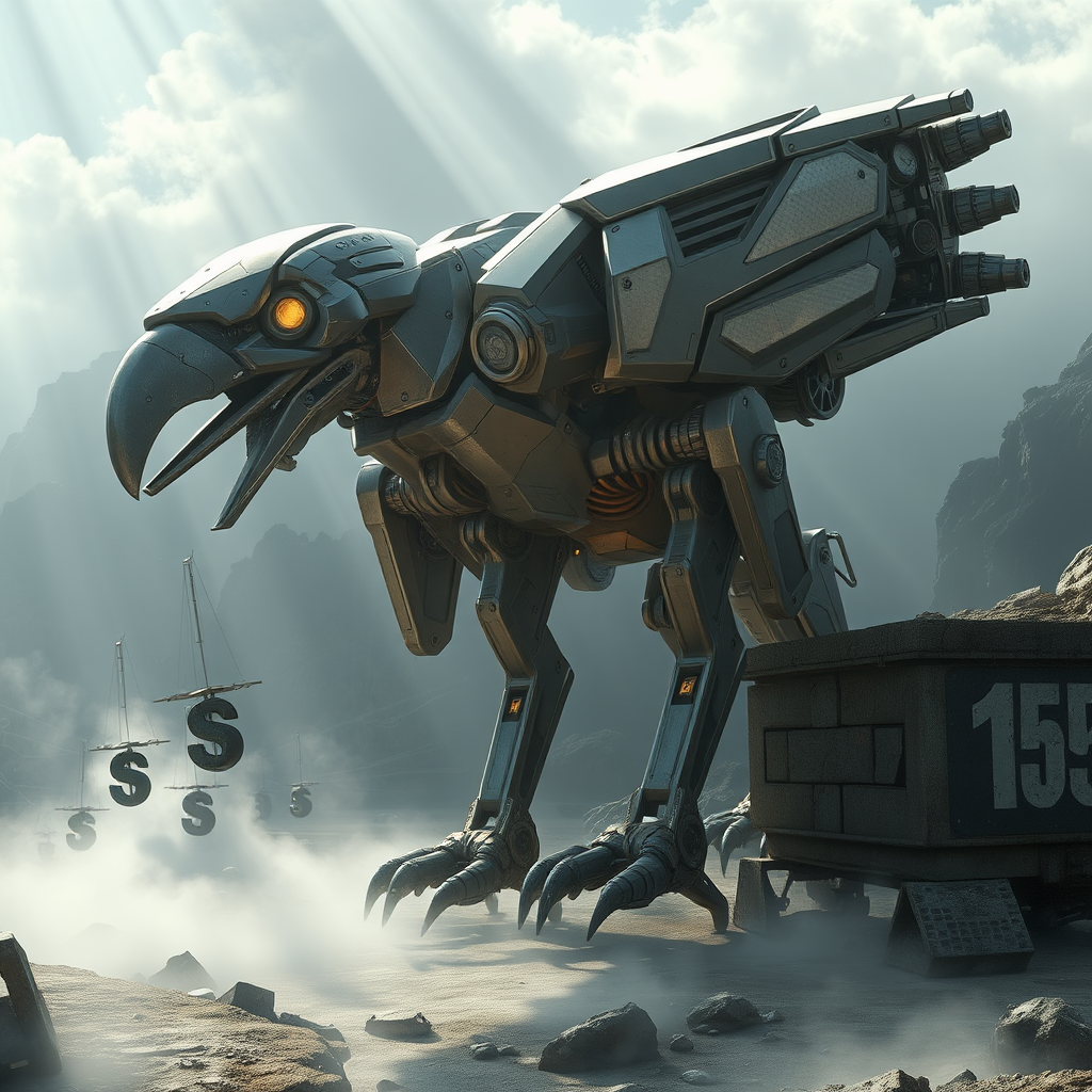 An enigmatic contraption resembling a massive robotic bird of prey emerges in a fantastical setting, its metallic structure glinting under ultra-high-definition scrutiny. The environment is adorned with ethereal godrays piercing through dense, swirling mists, illuminating the machine's intricate details and casting long shadows. Despite the advanced raytracing that highlights its impressive design, there are noticeable imperfections in its assembly; joints seem slightly disjointed, and an unsettling symmetry pervades its form. Limbs configure in perplexing alignments, with occasional extra appendages or missing segments. Its visage is both fascinating and unsettling, with asymmetrical features and wildly varying sizes of ocular sensors that give it an alien allure. The landscape around it is populated with faint texts and cryptic symbols, as if hinting at its mysterious origin or purpose, occasionally blurred and distorted, adding to the enigmatic ambiance. Some elements hover inexplicably alongside the creature, as though caught in a gravitational anomaly, which further accentuates its otherworldly presence.