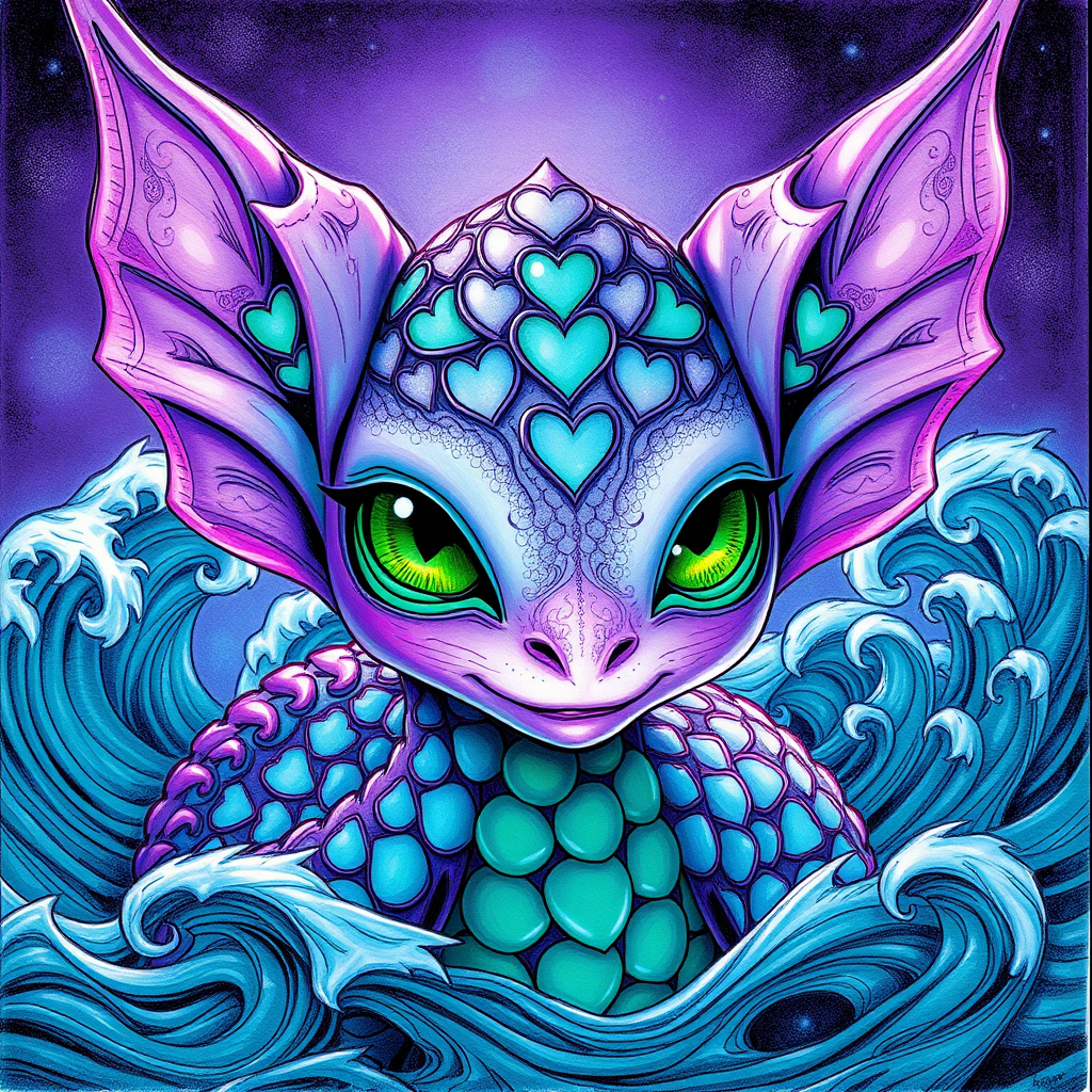An enigmatic fae with emerald eyes and shimmering lavender scales adorned with mesmerizing crescent patterns, set against a backdrop of mystical, swirling waves. This enchanting creature, envisioned in the vibrant style of Darwyn Cooke's illustrations, captures a sense of whimsical magic. It is presented in a harmonious 800x800 resolution, focusing on its enchanting aura through an exquisite sketch drawing, embodying an atmosphere of whimsical fantasy.