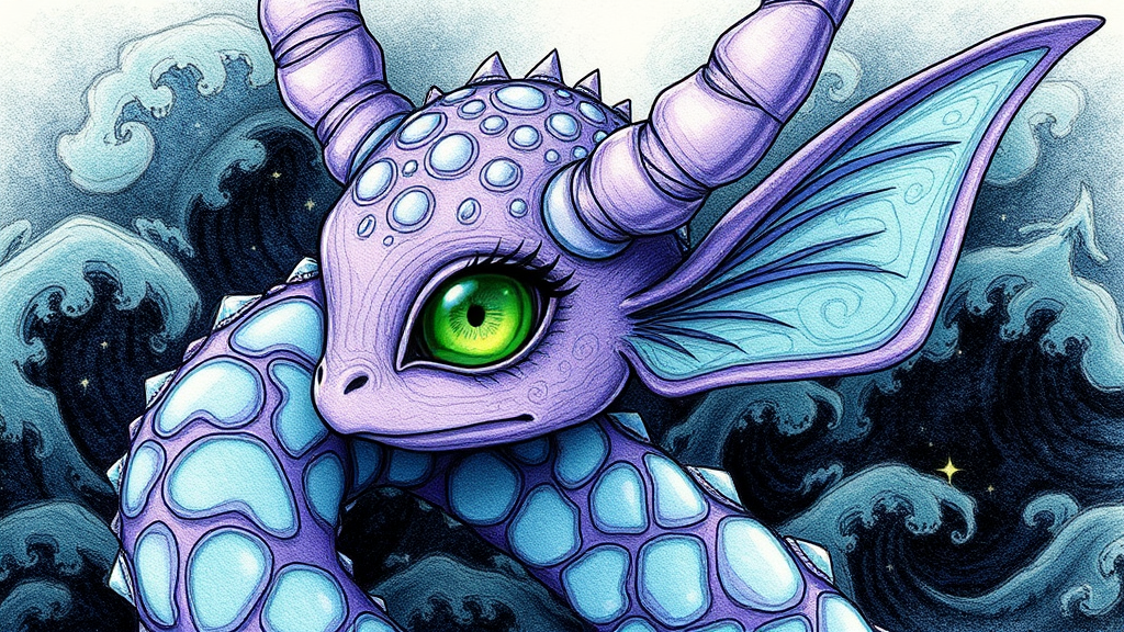An enigmatic fae with emerald eyes and shimmering lavender scales adorned with intricate moon-shaped patterns, set against a mystical background of enigmatic waves, illustrated in a style reminiscent of Darwyn Cooke. This 800x800 resolution artwork captures the creature's magical aura through a detailed sketch drawing highlighting whimsy; the fae exudes a sense of ethereal allure and otherworldly charm.