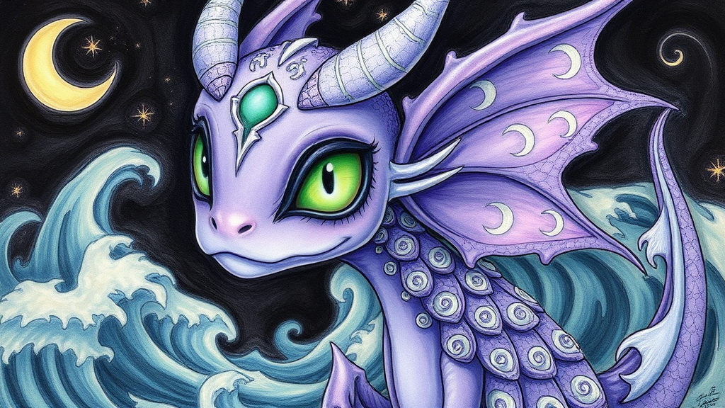 An enigmatic fae with jade-green eyes and iridescent lavender scales adorned with beguiling crescent moon patterns, set against an enigmatic backdrop of mystical swirling waves. The creature exudes a captivating magical aura, rendered in the whimsical style of Darwyn Cooke's illustrations. An exquisite sketch drawing portrays its enchanting essence, inviting an air of wonder. Resolution: 800x800.