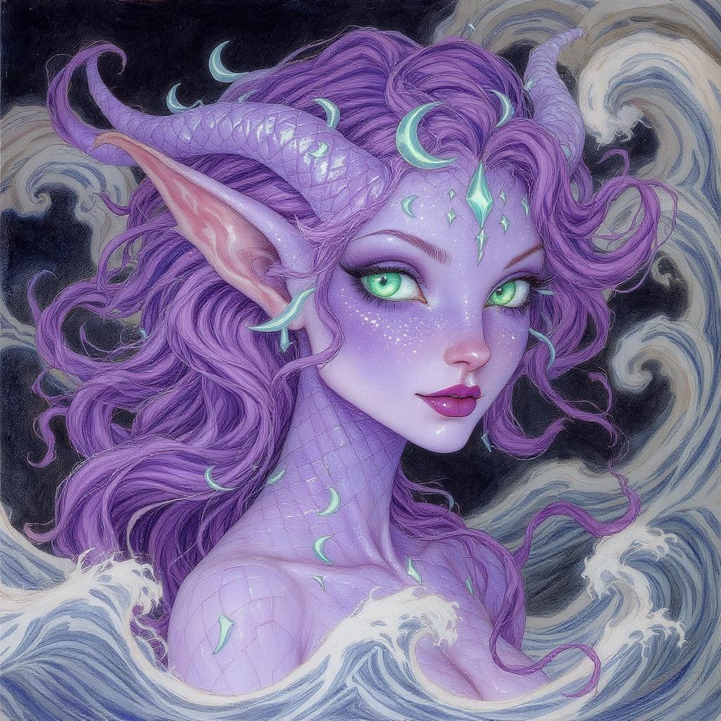 An enigmatic fae with shimmering emerald eyes and lustrous lavender scales adorned with enchanting crescent patterns, set against a mystical background of swirling, ethereal waves, capturing a sense of wonder. Inspired by Darwyn Cooke's illustrative style, this exquisite sketch showcases the creature's magical aura. A theme of whimsy permeates the piece, with an 800x800 resolution highlighting the fae's captivating presence in a harmonious fusion of style and fantasy.