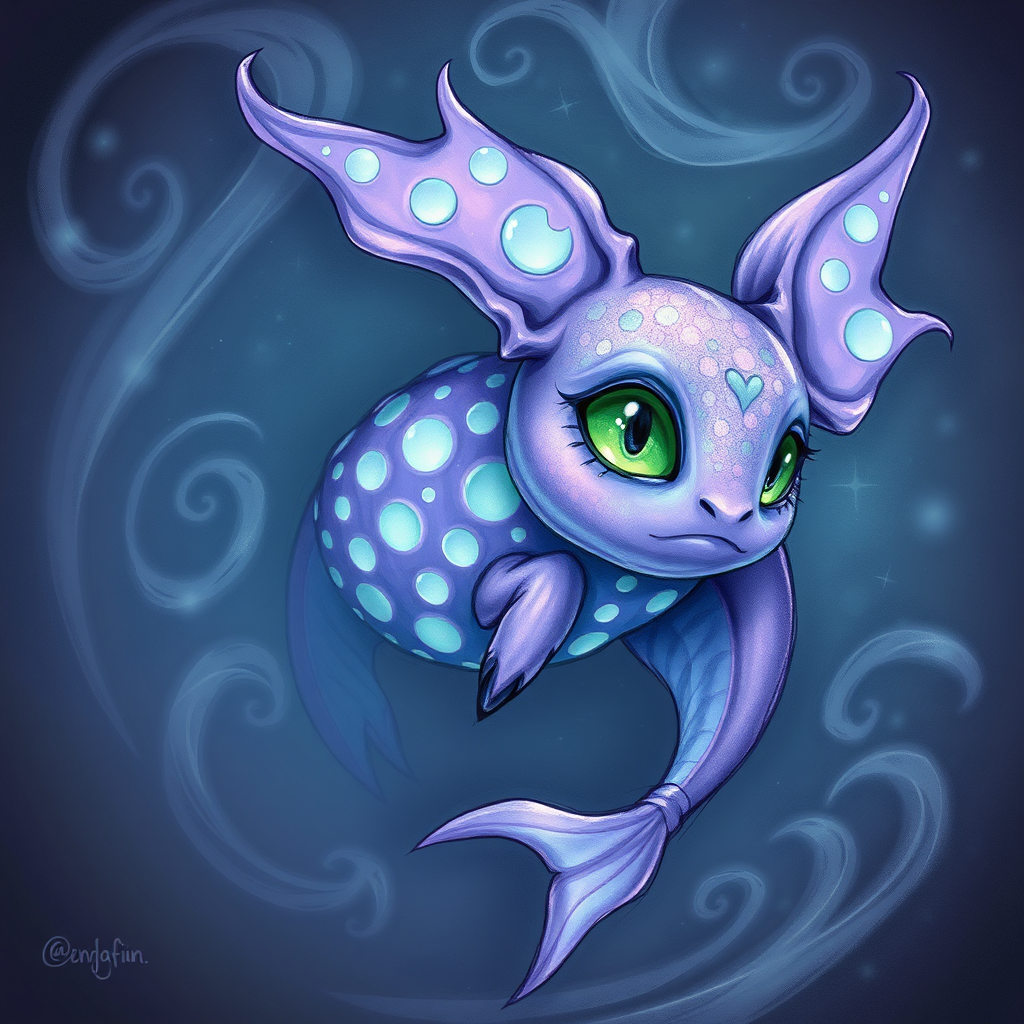 An enigmatic fae with shimmering lavender scales adorned with moon-shaped patterns, its emerald eyes exuding mystique; it floats amidst a backdrop of swirling, mystical currents. Inspired by Darwyn Cooke's illustrations, this exquisite 800x800 sketch captures the creature’s whimsical aura with a touch of charm, highlighting its magical essence in a fantasy-infused realm.
