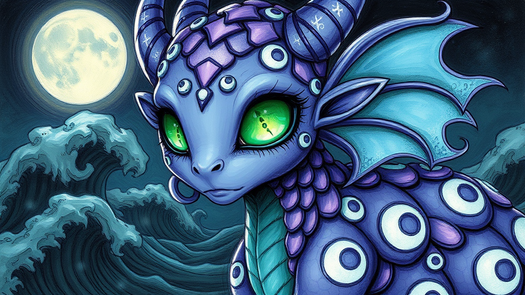 An enigmatic fae with striking emerald eyes and shimmering lavender scales adorned with enchanting crescent moon patterns, set against a backdrop of mysterious, mystical waves, art ideogram, this captivating creature rendered in the style of Darwyn Cooke illustrations in an 800x800 resolution sketch drawing, capturing its magical essence, theme: Whimsy.