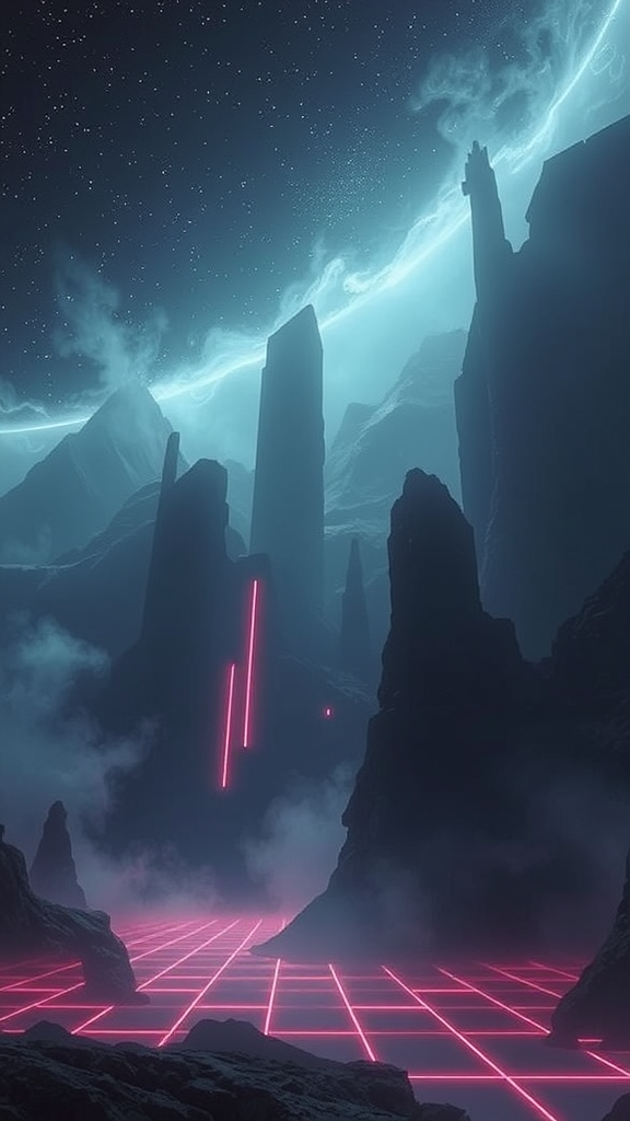 An enigmatic, futuristic landscape emerges under a shadowy, starlit sky, with pulsating neon grids and ethereal mist swirling around towering, abstract structures. This otherworldly scene invites contemplation, drawing the viewer into its depth with a mysterious allure and a subtle interplay of light and darkness.