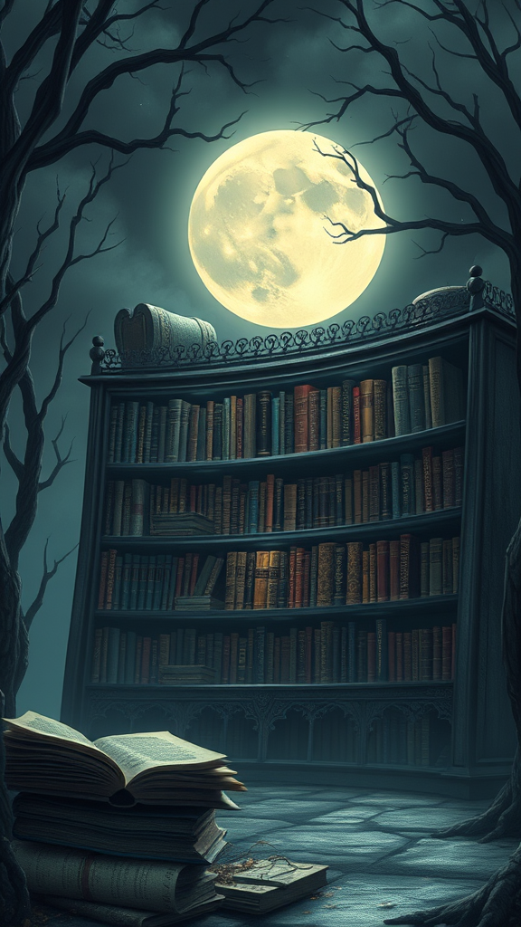 An enigmatic library appears only during the full moon, housing ancient tomes that whisper secrets of forgotten worlds to those who dare to listen.