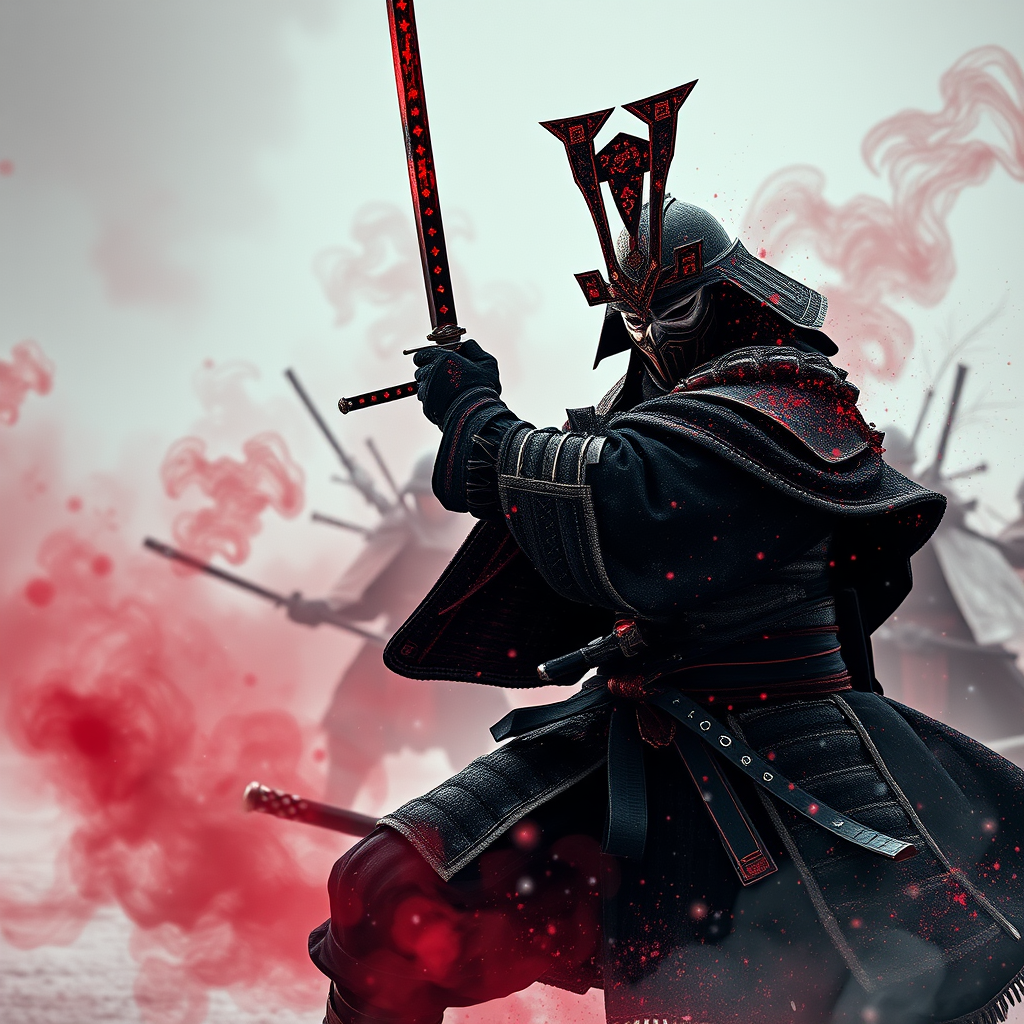 An enigmatic masked samurai, cloaked in stardust-adorned full body armor, wields a mystical katana with grace in a fierce clash against adversaries. Crimson red smoke billows around him, accentuating the drama of a vast, epic landscape reminiscent of the Sengoku period. The scene is both morbid and dark, capturing key visuals with a renaissance flair. Volumetric light sears through the winter battlefield, illuminating crimson red puddles beneath. The composition is reminiscent of Greg Rutkowski and Marc Simonetti's style, offering an incredibly detailed, ultra-wide shot rendered with digital art proficiency akin to Unreal Engine 5. This award-worthy scene resonates with atmospheric intensity, all captured in a captivating, highly realistic depiction, evoking the swift, resolute force of a mystical warrior on the tumultuous, snow-blanketed fields of battle.
