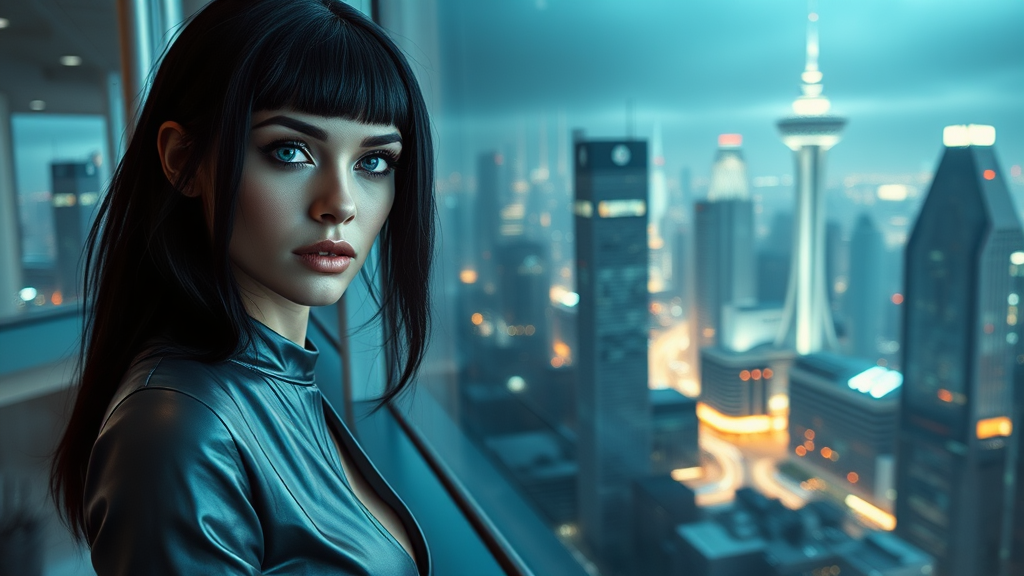 An enigmatic woman with obsidian hair and striking azure eyes, clad in a sleek ensemble, stands poised against a window. The chrome and glass of a futuristic cityscape stretch infinitely behind her, reflecting the vibrant pulse of neon lights that illuminate the vast, advanced metropolis. Her sharp gaze surveys the minimalist interior filled with smooth, flowing lines and soft hues that contrast with the city's sharp geometry.