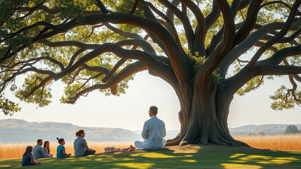 An enlightened sage seated beneath a centuries-old tree, radiating serenity and wisdom, their calm presence drawing the curious and the devoted alike, each seeking a glimpse into a realm of profound inner peace and insight.