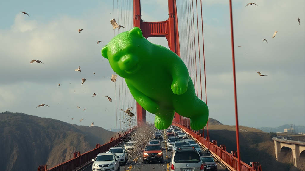 An enormous green gummy bear rampages across the Golden Gate Bridge, causing chaos and gridlock as vehicles scatter in panic, debris flying and the majestic suspension swaying under the uncanny weight; a cinematic doomsday scene unfolds as the city watches in shock and awe.
