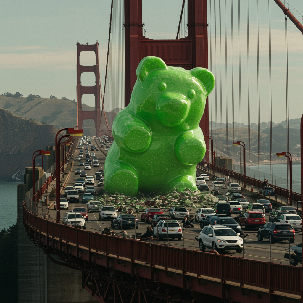 An enormous green gummy bear wreaks havoc on the Golden Gate Bridge, its gelatinous form causing chaos and halting traffic as panicked drivers abandon their vehicles, setting off a chain of destruction in a cinematic doomsday scene.