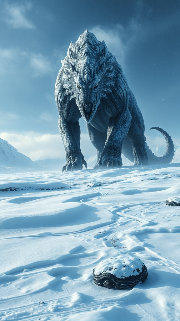 An enormous snow creature looms over the icy expanse, reminiscent of epic fantasy scenes, blending elements of a manticore with explosive wildlife energy. The beast moves with a powerful grace across the snow, its dark gray form blending seamlessly with the rugged terrain. Its eyes, filled with a strong and fierce expression, stand out against the backdrop of a cold and detached atmosphere. The hyper-realistic details capture each sinew and muscle as it shifts, its claws carving subtle trails in the snow. The scene marries the wild essence of mythical beasts with the meticulous detail of a National Geographic photo. Evoking the dramatic style of Salvator Rosa, the composition is a digital art masterpiece in 32k UHD that captures the raw, untamed beauty of the fantasy wilderness.