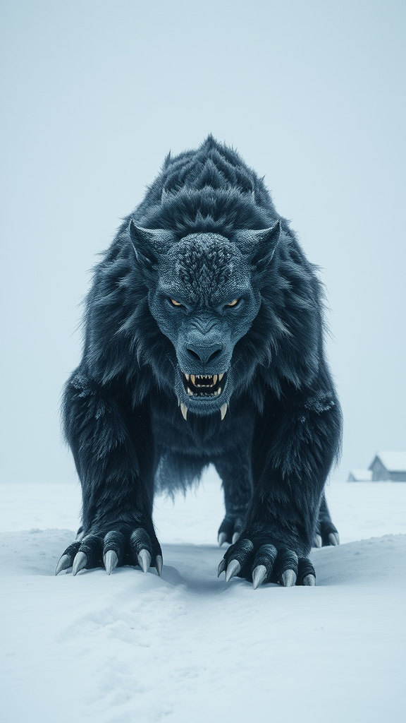 An enormous snow monster stands majestically on the icy terrain, evoking the grandeur of an epic fantasy scene. Its features are reminiscent of a manticore with a touch of explosive wildlife energy, meticulously rendered with dark gray fur that blends seamlessly with the wintry backdrop. The creature embodies elements of caninecore, showcasing a strong facial expression that captures a haunting yet noble presence. This mythical beast, created with hyper-realistic details and in stunning 32k UHD, is both a photorealistic masterpiece and a work of digital fantasy. As it prowls toward the snow, its formidable claws leave a trail that hints at ancient legends and timeless power. The atmosphere is cold and detached, reminiscent of a National Geographic photo crossed with the dramatic flair of Salvator Rosa. This realistic, hyper-detailed creation offers a glimpse into a world where mythical creatures reign, forever suspended between reality and imagination.