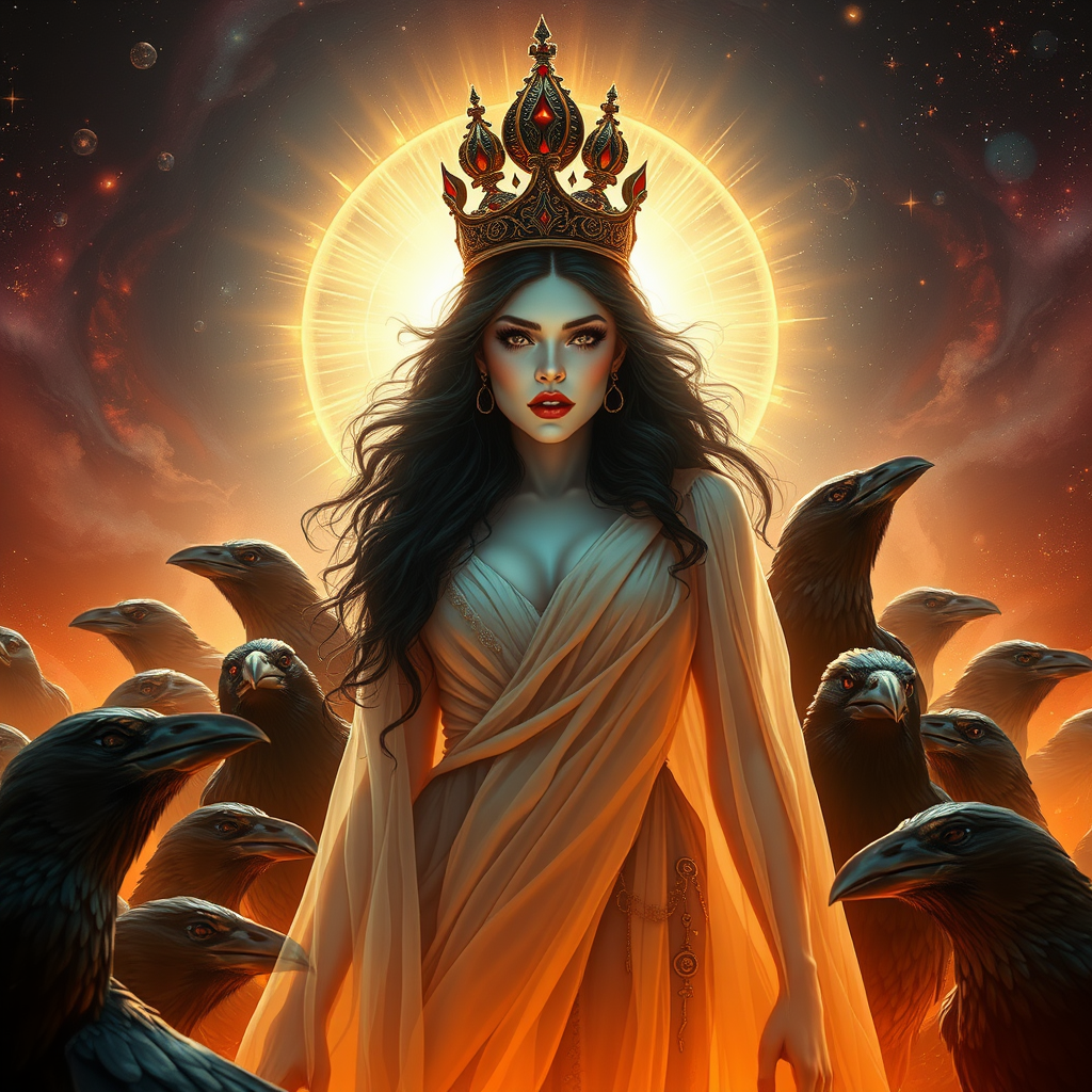 An enraged and alluring queen of ravens, her beauty fierce and captivating, is enveloped by a golden aurora that dances around her with a dramatic flair. In a display of raw power, she commands her black-plumed legion, her red lipstick striking against her icy blue complexion. Her hair, a cascade of rich black, contrasts with eyes the color of deep twilight. Envisioned in an alternate World of Warcraft realm, the scene takes on a psychedelic quality, as if viewed through the lens of creation itself. Draped in a translucent silk gossamer dress, she stands amidst a cosmic backdrop of swirling stars and galaxies, her form a full-body embodiment of ethereal majesty. The image, captured from a low angle, is reminiscent of Greg Rutkowski's imaginative style, with an ornate crown perched upon her head, casting god rays in a burst of radiant light. Behind her, an iridescent red halo adds to the macabre atmosphere, enhancing the dark fantasy setting with hyper-realistic intensity. The environment is ultra-detailed, worthy of an ArtStation masterpiece, in a wide-angle, cinematic portrayal that balances sharp clarity with dreamy otherworldliness. The entire scene is rendered in octane, achieving a level of photorealism that melds seamlessly with the imaginative vision.