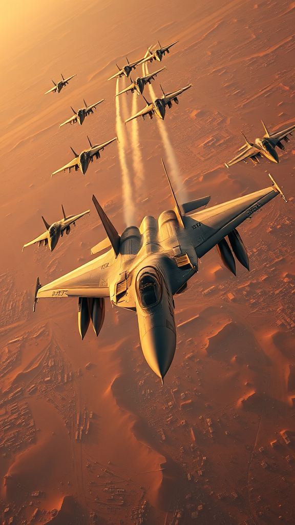 An epic action scene featuring an F-14 fighter jet flanked by its squadron, engaging in a high-stakes battle against enemy fighter jets over the arid landscapes of the Middle East. The skies are alive with the roar of engines and the streaks of air-to-air missiles, capturing the intensity of combat. Shot with stunning realism using a Sony A7R IV and a G Master FE 16-35mm f/2.8 lens, the scene is viewed from a bird's-eye perspective, offering a hyper-detailed vista of the aerial choreography, all recorded by a DJI Phantom 4 Pro drone camera. It's golden hour, and the warm, glowing light adds a dramatic contrast to the action, creating a visual masterpiece akin to a Ridley Scott-directed film. The aspect ratio is 235:100, with a style score of 1000, achieving a visual experience that's both cinematic and breathtaking.