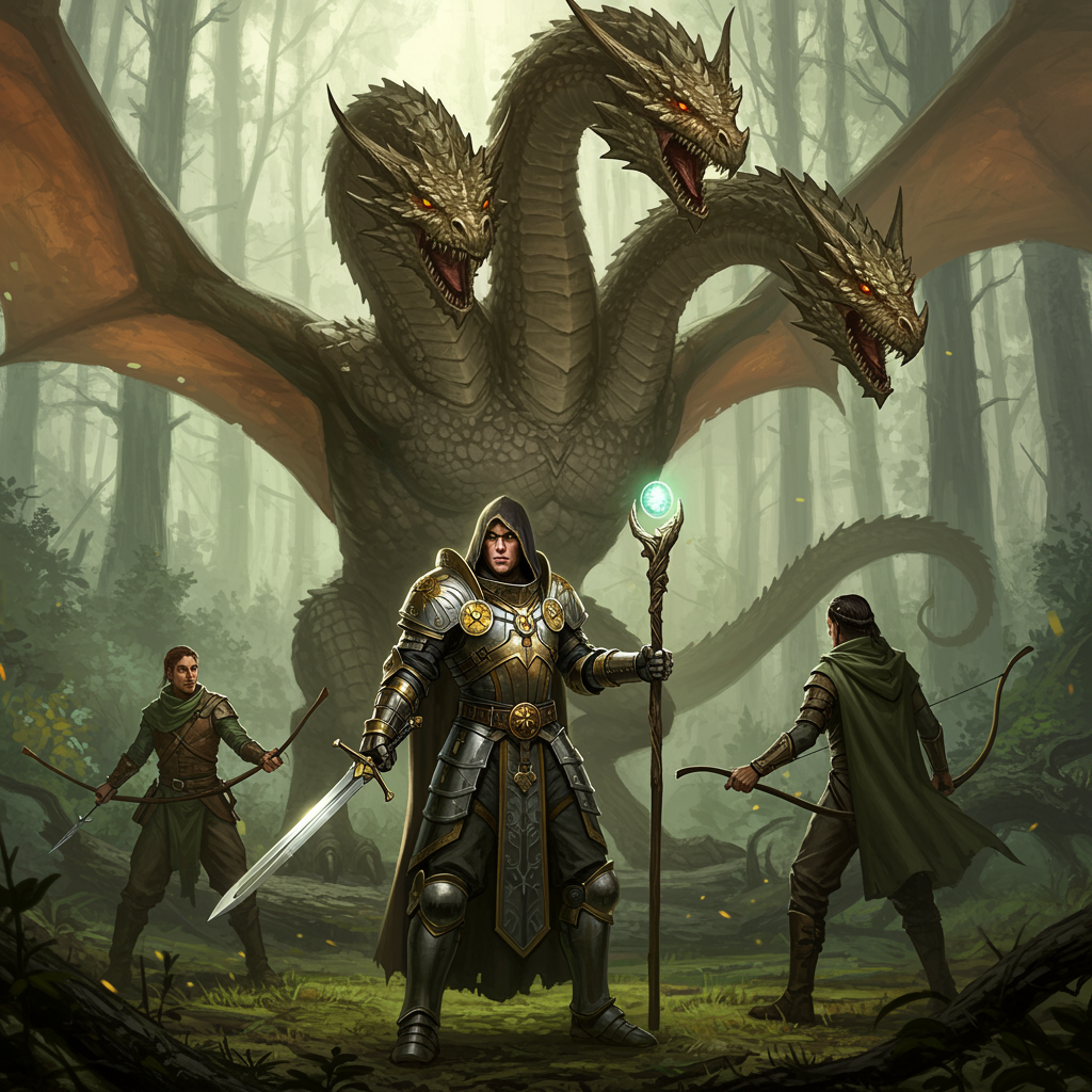 An epic fantasy battle scene unfolds in a vibrant yet desaturated forest, where a paladin stands in ornate armor, his sword and shield emitting a soft, subtle radiance. Beside him is a mysterious wizard shrouded in a hooded robe, adorned with intricate arcane symbols, and holding a staff crowned with a gently glowing orb. The shadows cast by the hood add an air of enigma to the wizard's face. On the other flank, a vigilant ranger in a meticulously detailed leather cloak grips a longbow, ready for action. Opposing them is a colossal three-headed dragon, each head covered in richly textured scales of muted tones, exuding both majesty and menace. The forest lighting is sharp, enhancing the crisp details of the characters amongst the clarity of the natural setting, showcasing an adventurous tapestry of heroism and mythical confrontation.