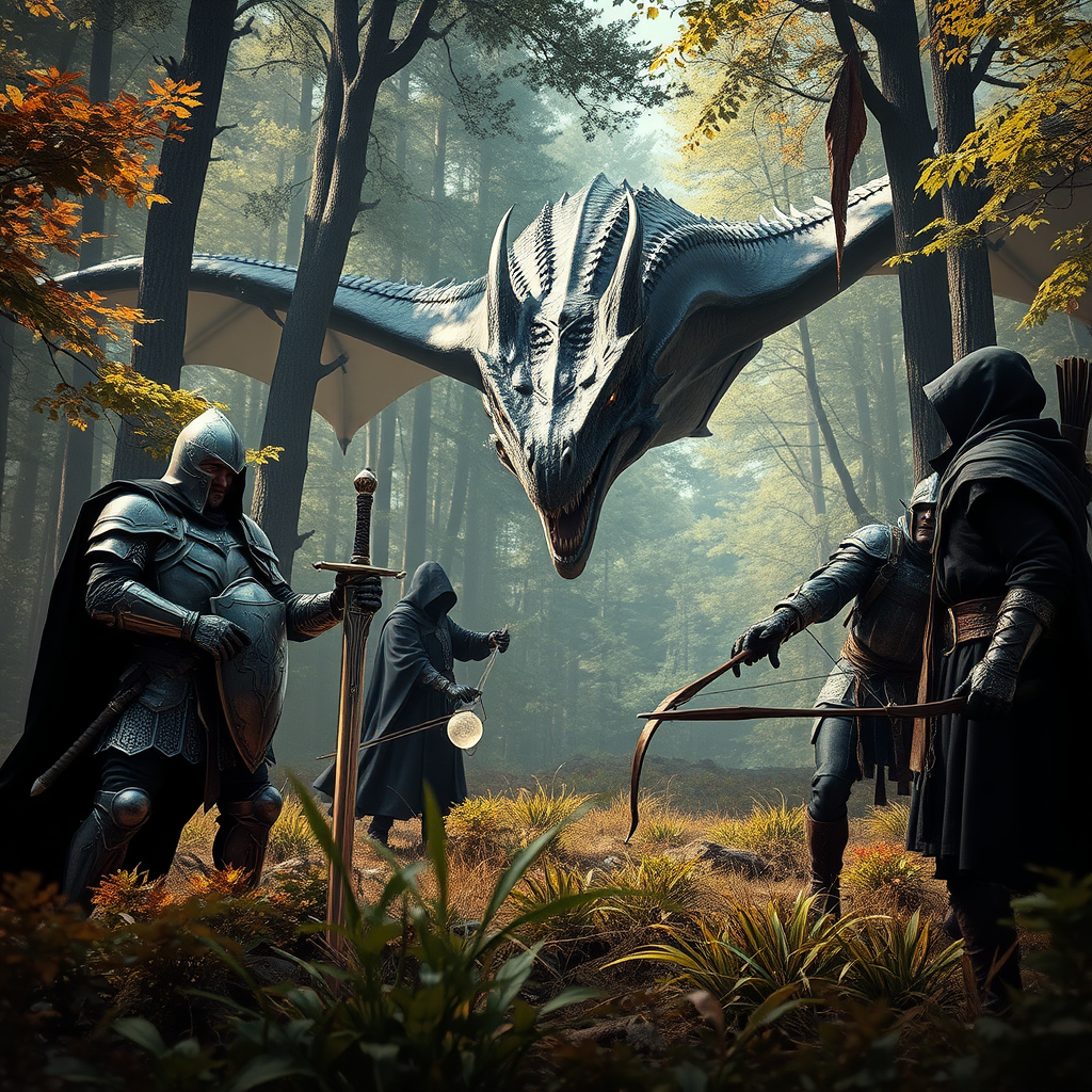 An epic fantasy battle unfolds in a vibrant yet desaturated forest, where a cinematic and photorealistic ambiance captivates the scene. Central to the action, a paladin stands in intricate armor, his posture heroic as a subtly radiant sword and shield catch the ambient light. Alongside him, a mysterious wizard with a hood concealing features, except for softly glowing eyes, wields a staff topped with a luminescent orb. Arcane symbols intricately etch the fabric of his deep-blue robe, adding an air of mystique. To their right, a vigilant ranger donned in a meticulously detailed leather cloak, poised with a longbow, exudes readiness. They confront a colossal, three-headed dragon whose richly textured scales with muted hues ripple with latent power. The forest setting amplifies the tension, as sharp, clear natural lighting enhances the crisp detail of foliage, contrasting the figures against the backdrop. The scene achieves a balance of tension and stillness, where every element is vivid, yet harmoniously understated.