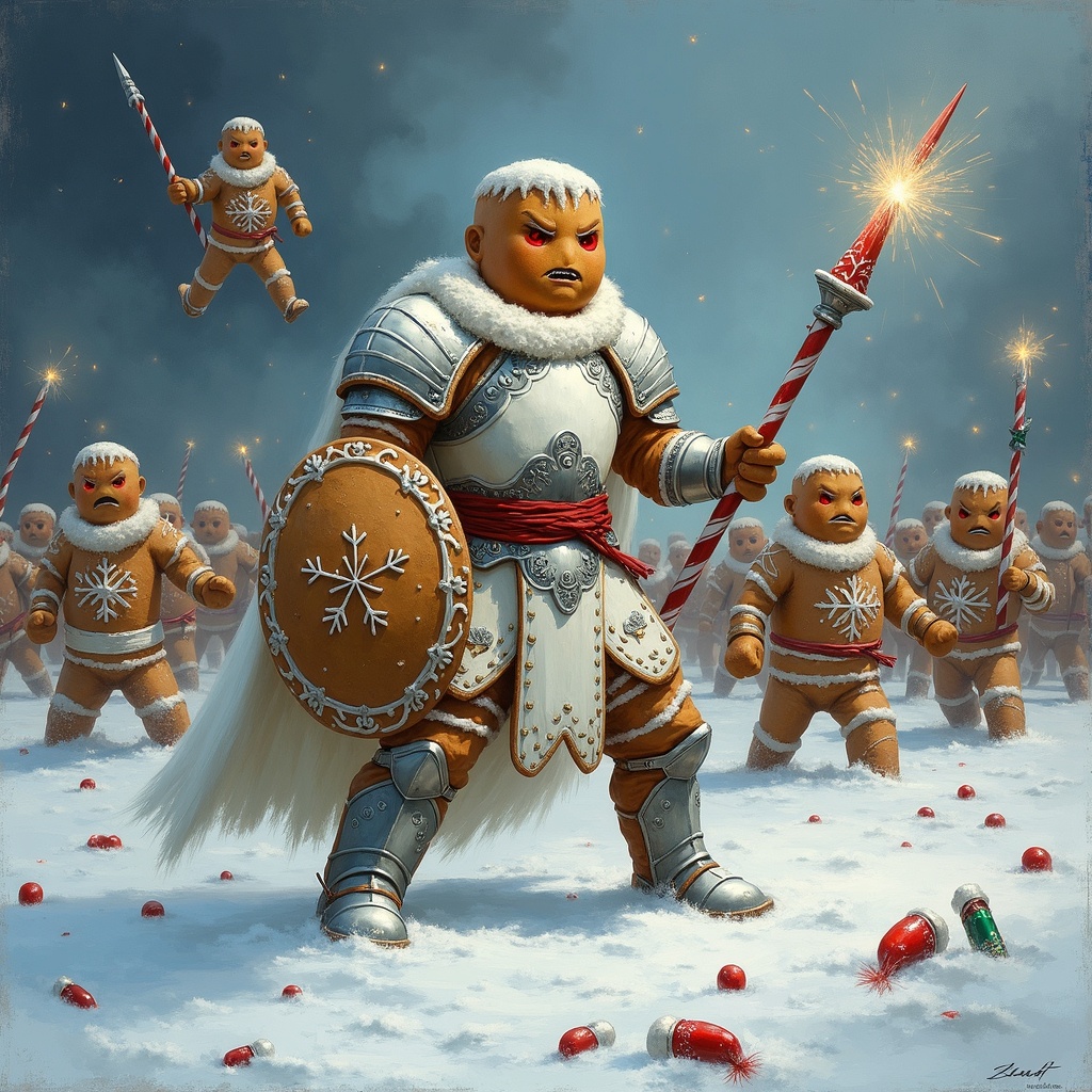 An epic oil painting of a gingerbread man warrior in ornate white and silver armor, holding a candy cane spear and a gingerbread shield with a snowflake design. He stands defiant in a snowy landscape, leading a vast army of angry gingerbread men, some with sparklers or candy cane weapons. Flying gingerbread men are visible in the background. The art style is painterly with visible brushstrokes, evoking a classic Christmas card aesthetic. Dramatic, dark lighting creates a moody atmosphere, with cool blues and grays contrasting with warm gingerbread tones and vibrant red and green candy elements scattered on the snow. Intricate details on armor and expressions.