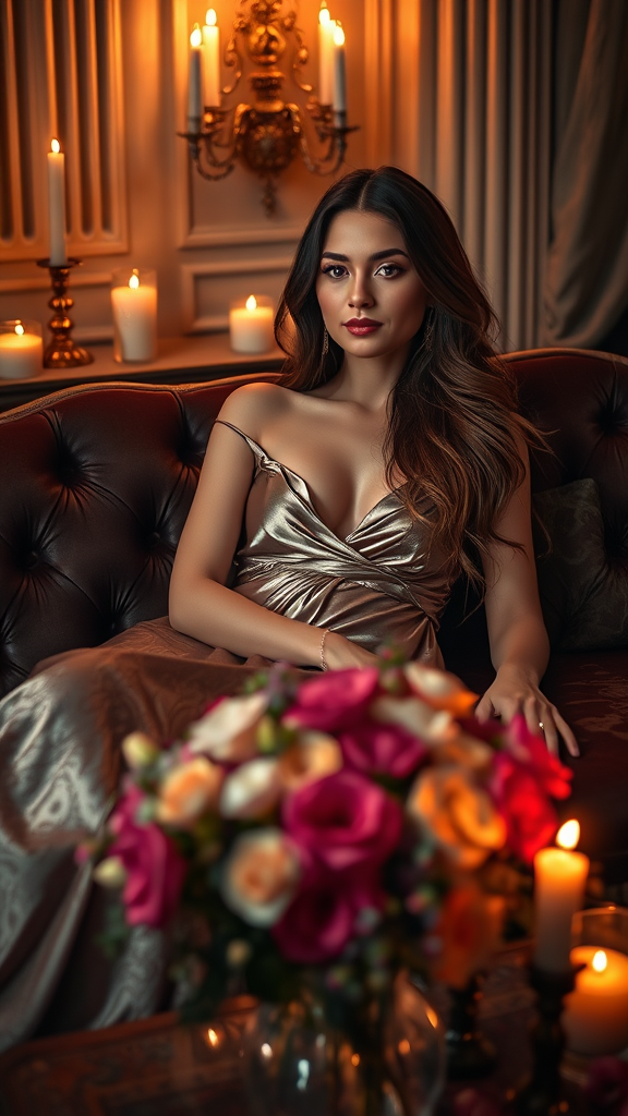 An epic portrait of a stunning woman lounging gracefully on a plush velvet sofa in a softly lit room, bathed in the warm glow of flickering candles. Her long, luxurious hair falls down her back in gentle waves. She is adorned in a delicate, shimmering silk gown that catches the candlelight beautifully. In front of her, a vase brimming with freshly cut flowers exudes a sweet, fragrant aroma. The romantic atmosphere conveys an air of serenity and allure.