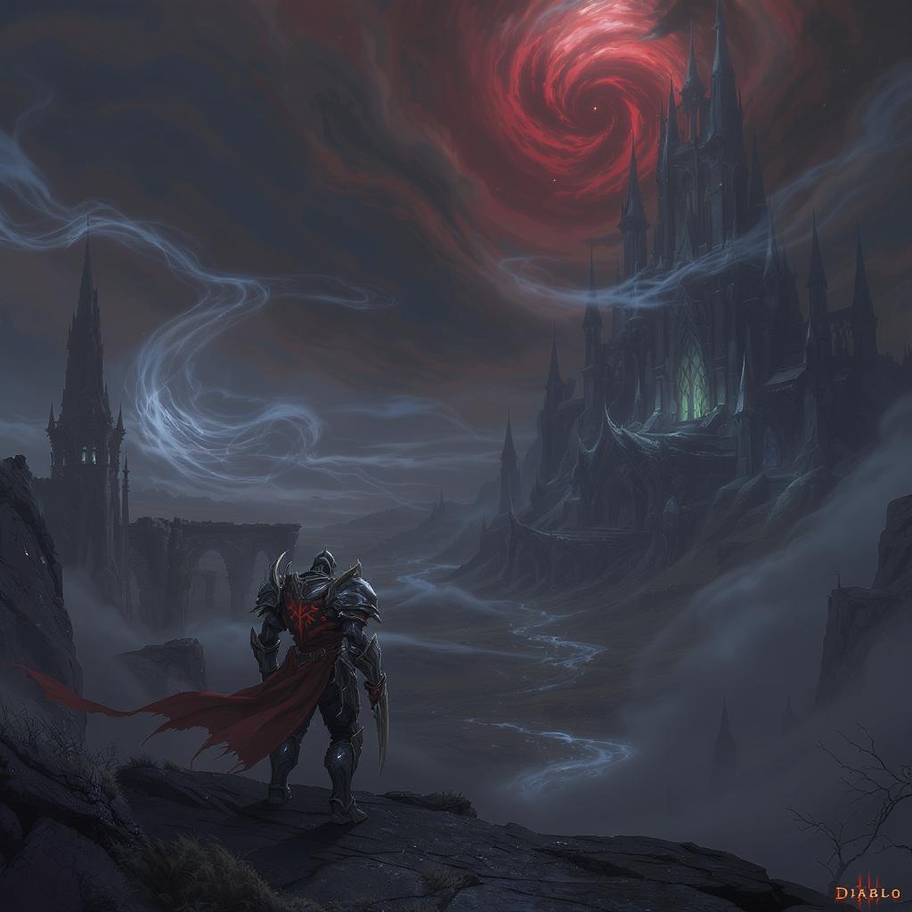 An epic, realistic illustration depicting a mystical and ominous landscape inspired by Diablo 4, with dark, soothing tones. The scene features towering gothic architecture surrounded by swirling mists, casting eerie shadows over vast, desolate plains. In the foreground, a lone warrior, clad in intricately detailed armor, stands poised for battle, their silhouette framed by the eerie, ambient glow of an otherworldly red sky. The overall atmosphere is a balance of menacing and captivating, drawing the viewer into a mysterious, otherworldly realm.