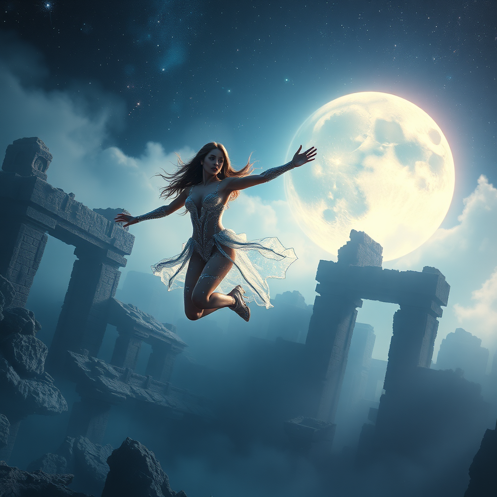 An epic scene unfolds as a girl adorned in a provocative outfit woven from the finest crystalline threads glides effortlessly through the ruins of an ancient, mystical realm. Her diamond-like skin glistens with extra sparkles and shimmers under the luminescent glow of a colossal moon. This girl, a vision of divine beauty, flies with superhuman grace, embodying the ritual ascent of a deity. The atmosphere is hyper-detailed, hyper-realistic, encompassing a 4D dimension with a swirling ultramarine fog enhancing the mysterious ambiance. A dark aesthetic envelops the scene, capturing her in a scandalous, yet powerful action pose. Her full body is poised in an alluring position, evoking the enchanting allure of dark fantasy, reminiscent of the artistry of Antonio J. Manzanedo. Rendered in Unreal Engine, the scene is brought to life with the striking imagery of a galaxy, rendered with the finesse of 3D Octane Ranger, all within a richly detailed, ambient setting.