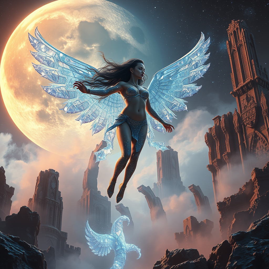 An epic scene unfolds with a girl in a provocative outfit crafted from the finest crystalline threads, her skin like diamonds, sparkling and shimmering intensively under the glow of a colossal moon. She is divinely beautiful, soaring with superhuman grace over mystical, otherworldly ruins, embodying the ritualistic ascent of a deity. This hyper-detailed and hyper-realistic depiction brings a sense of a fourth dimension, with swirling ultramarine fog enhancing the dark aesthetic. Captivating in a scandalous action pose, she displays her full body in an alluring stance. The dark fantasy scene is inspired by Antonio J. Manzanedo, rendered with an unreal engine, set within a galaxy adorned with the sharp detailing of a 3D octane ranger.