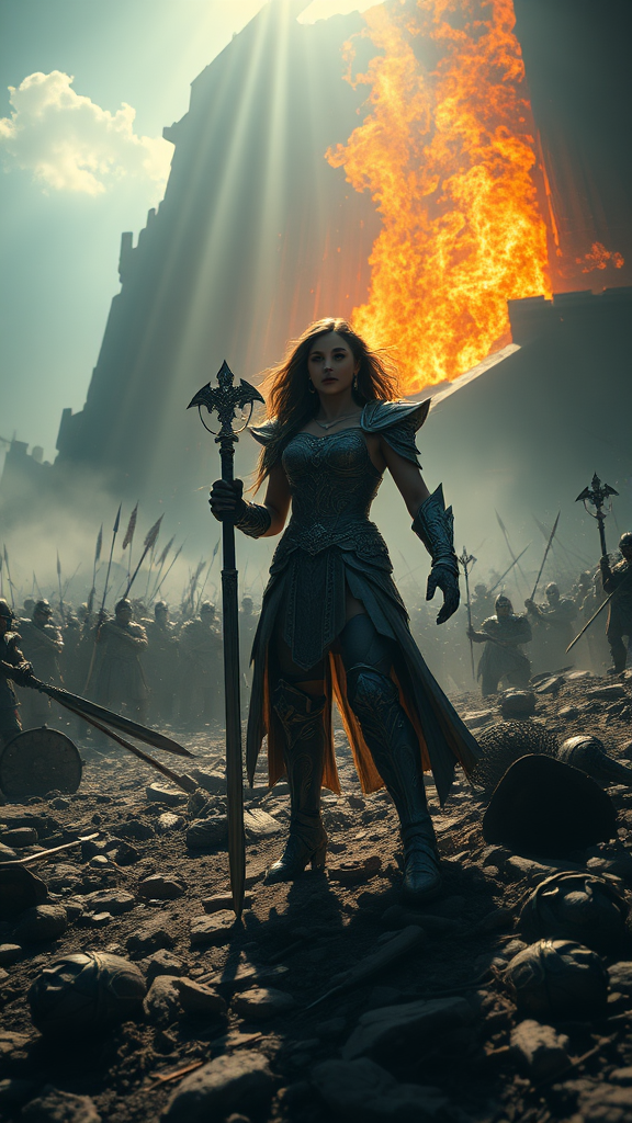 An epic wide shot captures a stunning and powerful warrior woman, a gorgeous elf, at the heart of a massive-scale battlefield. She stands amidst the chaos, posed in slow motion amidst the turmoil, embodying a goddess-like presence of rage and power. Her intricate armor and weapon gleam under the sunlight as crepuscular rays break through the murky atmosphere of this dark fantasy setting. Forgotten remnants of past battles are scattered across the ground, while a towering wall of fire looms in the background. The scene's aerial perspective adds depth, with a photorealistic focus highlighting every detailed and hyperrealistic aspect, reminiscent of Dragon Age's style. Sunbeams create a dramatic interplay of light and shadow, enhancing the mystique of this realistic and complicated maximalist visual masterpiece.