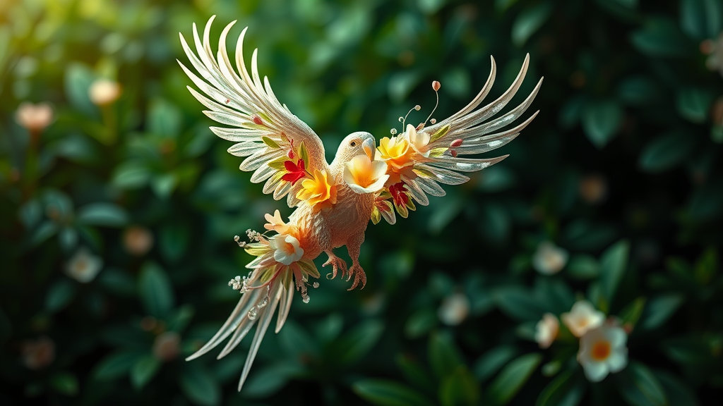 An ethereal 3D form resembling a parrot in graceful flight, its wings an intricate blend of abstract foliage and delicate flowers, softly illuminated from within; set against a lush emerald backdrop, the creation exudes a sense of vibrant life and gentle luminescence.
