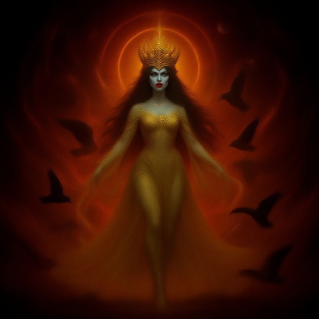 An ethereal and breathtaking scene captures the bloodlust of an enraged, stunning queen of ravens, her presence electrified by a golden aurora swirling around her. She stands as a dramatic and captivating femme fatale, commanding the ravens with an air of undeniable authority. Her striking red lipstick contrasts with her icy blue complexion and lustrous black hair cascading like a waterfall. Her eyes, a deep Pantone 2766, pierce through the mystical landscape inspired by World of Warcraft. The scene unfolds in a world that feels both psychedelic and surreal, reminiscent of a rebirth within a cosmic birth canal. She wears a delicate silk gossamer dress, which dances around her in the cosmic breeze, with stars and galaxies painting the vast backdrop. This full-body portrait, inspired by the art of Greg Retkowski, showcases her ornate, ethereal crown adorned with intricate details. Bathed in god rays and radiant light, the scene emerges as a low-angle masterpiece. A captivating iridescent red halo envelops the environment, an ultra-realistic stage set in a meticulously detailed world. The atmosphere is macabre, yet beautifully atmospheric—an art station rendition of dark fantasy hyperrealism. This epic wide shot, rendered in ultra-realistic detail, sharp focus, and with the precision of an octane render, embodies a cinematographic splendor that captivates the viewer.