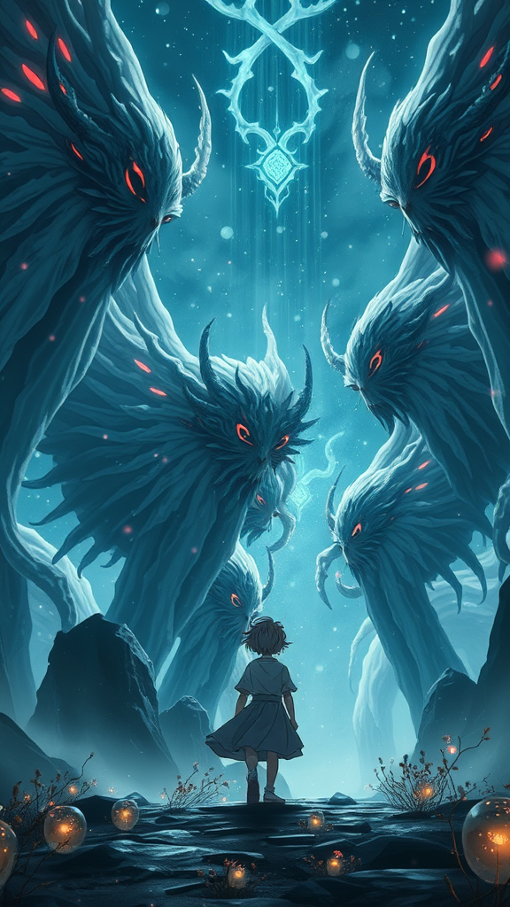An ethereal anime scene where spirits whisk away a young protagonist through a mystical, otherworldly landscape, reminiscent of Hayao Miyazaki's visionary style, captured in stunning 8k high definition. The image features intricate contour lighting and striking high contrast, emphasizing the rich depth of field and ultra-detailed textures. The photorealistic quality brings out the haunting beauty of the gigantic spectral beings, their towering forms both awe-inspiring and ominous. From a first-person perspective, the view is filled with cinematic grandeur, immersing the viewer in a dark-toned realm sprinkled with dreamlike bokeh effects, creating an epic frame that showcases the super realistic texture and meticulous details of this enchanted world.
