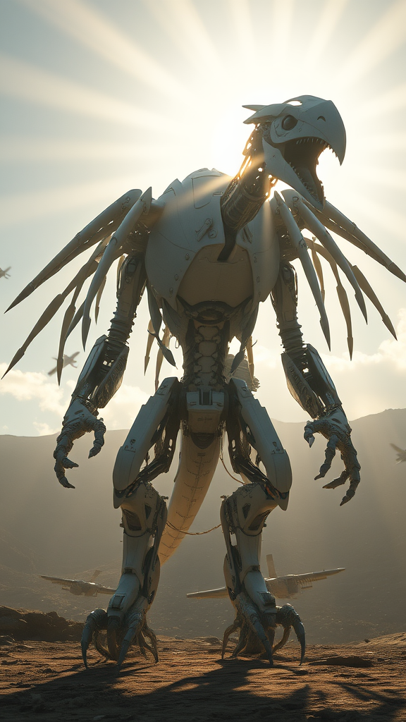 An ethereal contraption resembling a gigantic robotic raptor stands majestically, enveloped in UHD clarity with intricate raytracing effects. Sunlight filters through, creating dramatic godrays that accentuate its presence. Despite a semblance of precision, the machine displays chaotic anatomy with distorted limbs and strange appendages. Its fingers are an amalgam of too many and too few, conveying a sense of eerie imperfection. Textual errors and digital distortions dance across its surface with jpeg artifacts, giving it an uncanny low-quality vs normal quality texture clash. The silhouette is partially blurred, as if caught in motion, while random artifacts like floating limbs and fused fingers suggest glitches in its design. Its face, misshapen and surreal, features mismatched eyes and a peculiar double mouth. The peripheral elements exhibit signs of digital faults with cloning errors, including two conjoined heads and floating weapons hovering near. This enigmatic entity, while deformed and fragmented, stands as a testament to an alien technology defying the human sense of aesthetics and functionality.