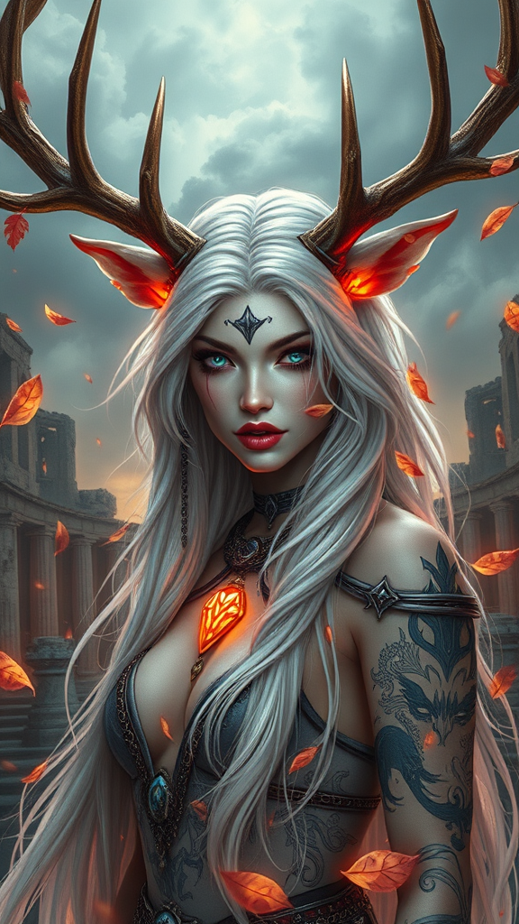 An ethereal depiction of a captivating goddess-like figure with striking deer antlers and an enchanting aura. Her alabaster skin and flowing white hair create a stunning contrast, while her mesmerizing, intricately detailed eyes hold a sense of fierce determination. Adorned with tattoos and ornate jewelry, she embodies a provocative yet surreal allure. The scene is brought to life with vibrant, glowing accents and the subtle motion of falling leaves mingling with fire particles. Set against a backdrop of ancient ruins under a mystical, apocalyptic sky, the volumetric light casts a ghostly glow, imbuing the character with both mysticism and realism. This visually arresting portrait draws inspiration from the artistry of Sophie Anderson and Artgerm, evoking the essence of a formidable game character in a breathtaking, high-resolution illustration.