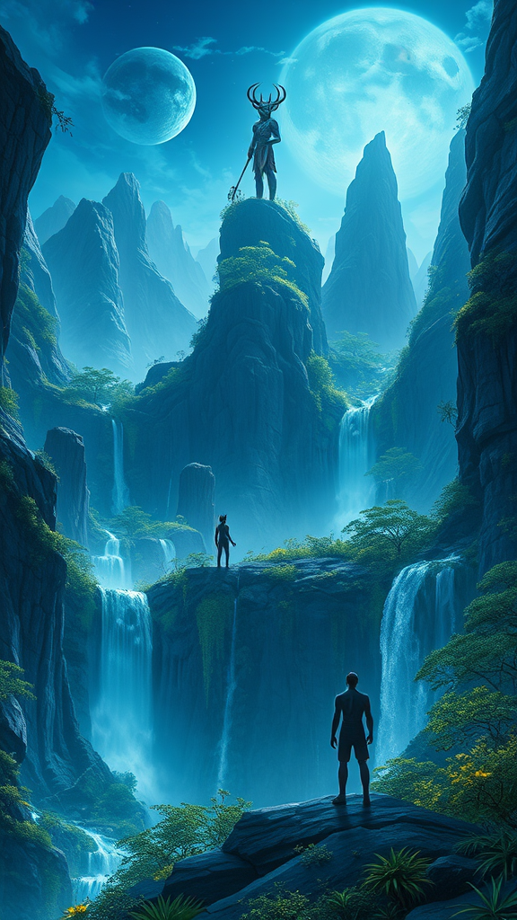 An ethereal depiction of the Na’vi on the alien world of Pandora, inspired by Avatar and set in a science fiction realm. The scene captures the vibrant, bioluminescent flora and fauna of Pandora, with a towering Na’vi figure gazing into the distance. A woven landscape of floating mountains and cascading waterfalls forms the backdrop, while the deep blue and green hues convey the planet's otherworldly beauty. This illustration echoes the cinematic artistry of James Cameron, blending elements of wonder and adventure in a visually stunning, vertical composition.