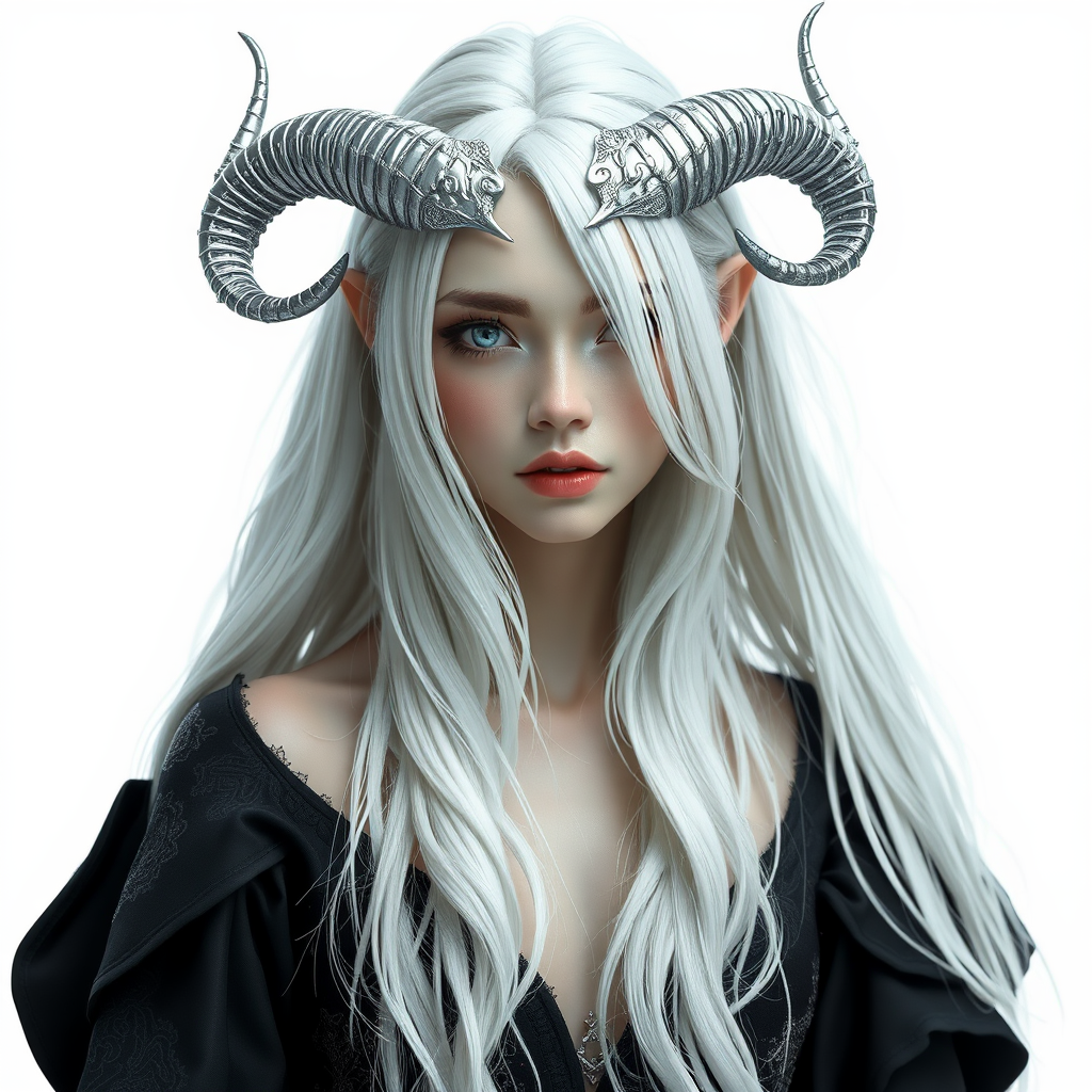 An ethereal girl with intricate silver horns, possessing stunning beauty and long, flowing white hair, stands in an elegant pose against a plain white background. Her skin is intricately detailed, highlighting every contour and shadow with precision. Her hair cascades in meticulously rendered strands, each caught in a delicate dance of light and shadow. She wears intricately detailed clothing, combining fantasy elegance with a hint of modern edge. Her face, while sublimely beautiful, holds a captivating intensity, drawing you in with a deadly allure. The image is captured with sharp focus, achieving an ultra-realistic appearance that blurs the line between art and reality. It presents a vision of photorealism, akin to concept art crafted with the advanced technology of octane render and the capabilities of the unreal engine.