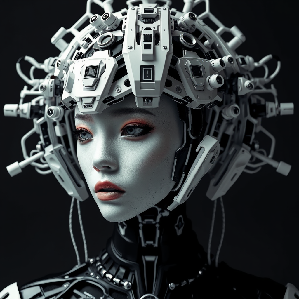 An ethereal image of a futuristic woman adorned in intricate robotic headgear, blending dark white and deep black tones, with influences from ancient Chinese art. Her presence is reminiscent of immersive audio-visual installations and dada-inspired sculptures, set within a steelpunk aesthetic. The design is meticulously symmetrical, evoking a sense of balance and harmony while maintaining a futuristic allure. The overall composition is strikingly avant-garde, with a focus on elaborate details and a seamless fusion of technology and tradition.