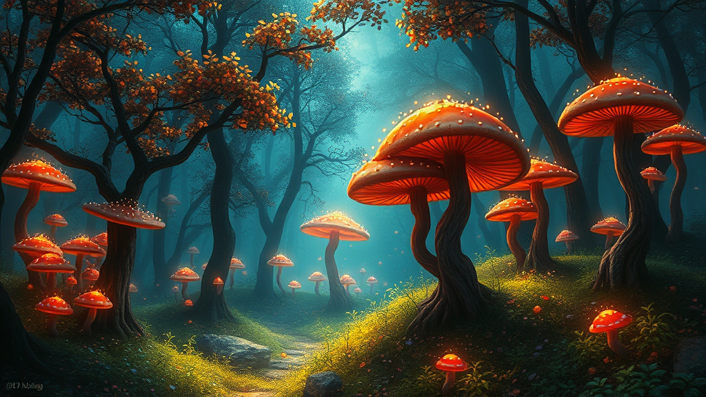 An ethereal masterpiece painting captures the enchanting essence of a fairy forest, illuminated by dreamlike light and vibrant colors. Mushroom-shaped trees dot the landscape, casting mysterious shadows in the dim illumination. The scene is intricately detailed, evoking the surreal quality of an unreal engine 5 creation, reminiscent of Vincent Van Gogh's style. The image boasts UHD and HDR quality, reaching a stunning 16K resolution. Despite its fantastical elements, it steers clear of 2D jpeg artifacts and maintains high clarity. Unlike low-quality images, there are no watermarks, logos, or text intrusions. The artwork conveys a sense of otherworldly beauty, free from blurriness, cropped elements, or duplications. This dreamlike vision remains firmly within its frame, exuding originality and unparalleled quality.
