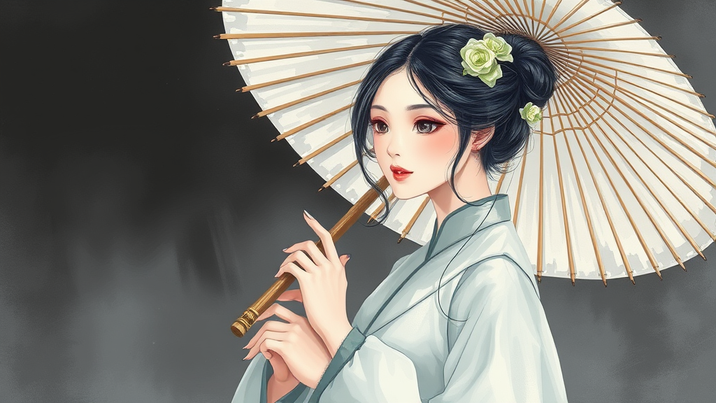 An ethereal painting of a woman in traditional Chinese attire, elegantly holding a bamboo umbrella. The romantic manga style brings out her delicate beauty, with dark white and light gray hues blending seamlessly. Graceful transparency and soft touches of light green enhance her enchanting presence. The illustration captures the essence of feminine sensibilities, creating an awe-inspiring scene that feels almost otherworldly in its exquisite detail and romantic charm.